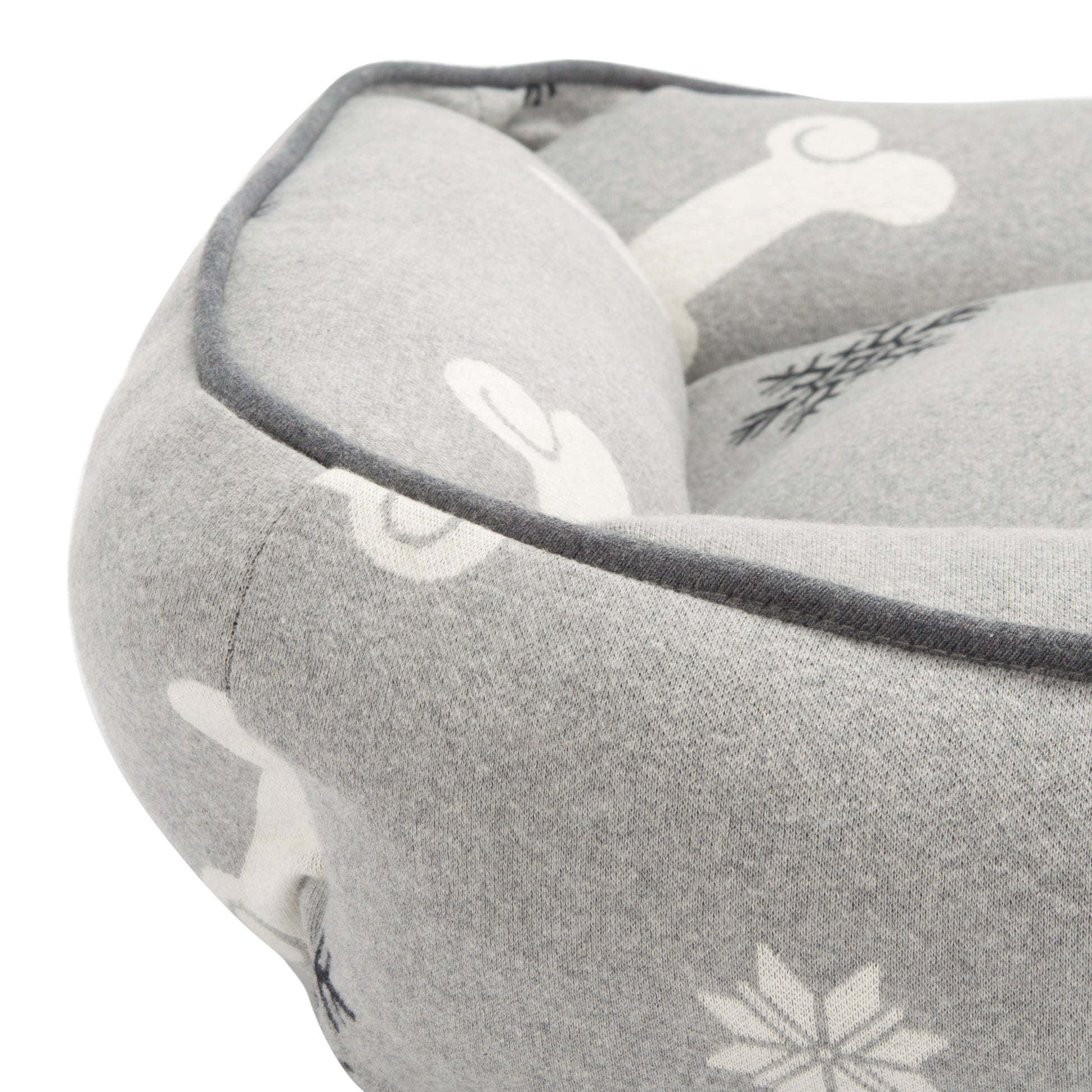 Wrap your beloved pet in the cozy embrace of our Snowflake Dog Bed, shaped in an elegant rectangle. Crafted in India, the bed proudly displays a charming grey and ivory snowflake and bone design, echoing a serene wintery scene. The resilient construction features a cotton cover and a pillowy polyester filling, set on a durable cotton backing. This plush haven is not only soft to the touch but also conveniently washable. Treat your furry friend to a touch of comfort and luxury with this stylish and utilitarian canine retreat.
