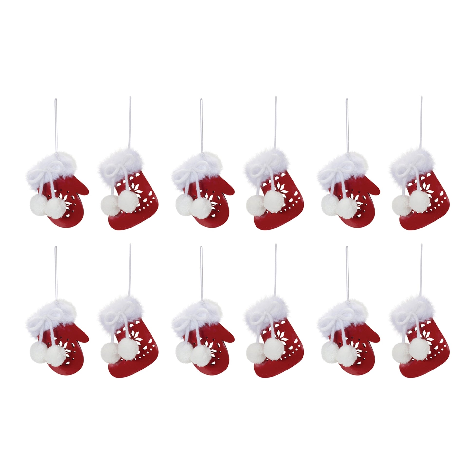 Add a traditional touch to your Christmas Tree with this beautiful set of Snowflake Mitten and Stocking Ornaments. Featuring 12 pieces, this set's festive red and white tones, traditional mitten and stocking shapes, and cut-out metal designs with fluffy accents are the perfect combination to create a memorable display. The quality metal composition with delicate string hanger is sure to endure for seasons to come. Whether you're adding a touch of cheer to your home or gifting to a loved one, these ornaments will definitely bring smiles to your home.