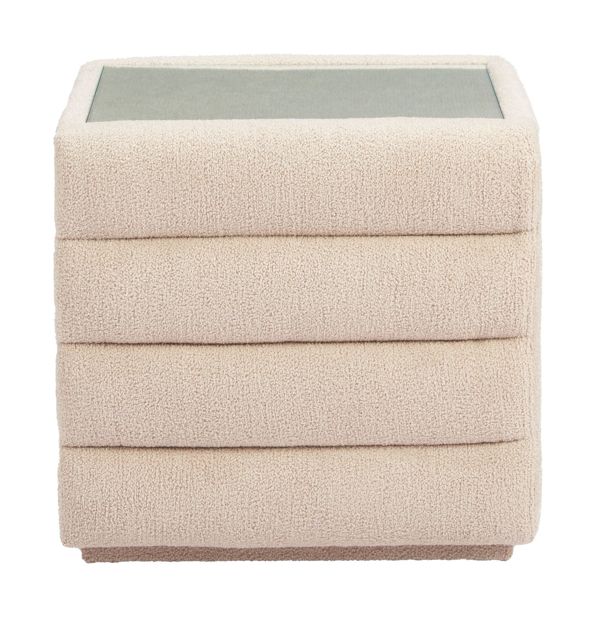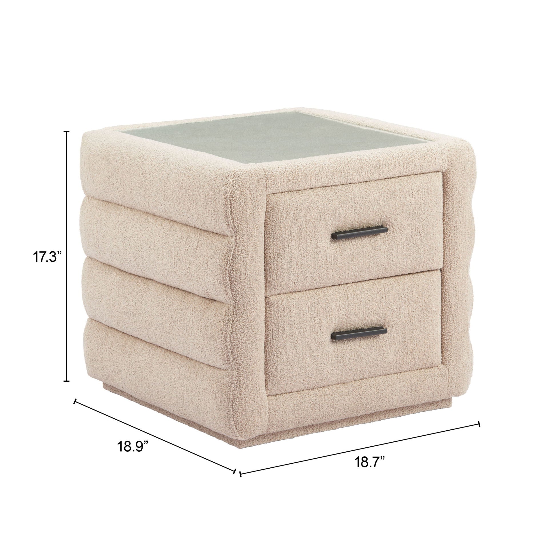 Elevate your interior with the Soffice Nightstand Beige, a modern masterpiece in beige. Made from shearling-style fabric (100% polyester) tempered glass and MDF, this piece provides both durability and elegance.