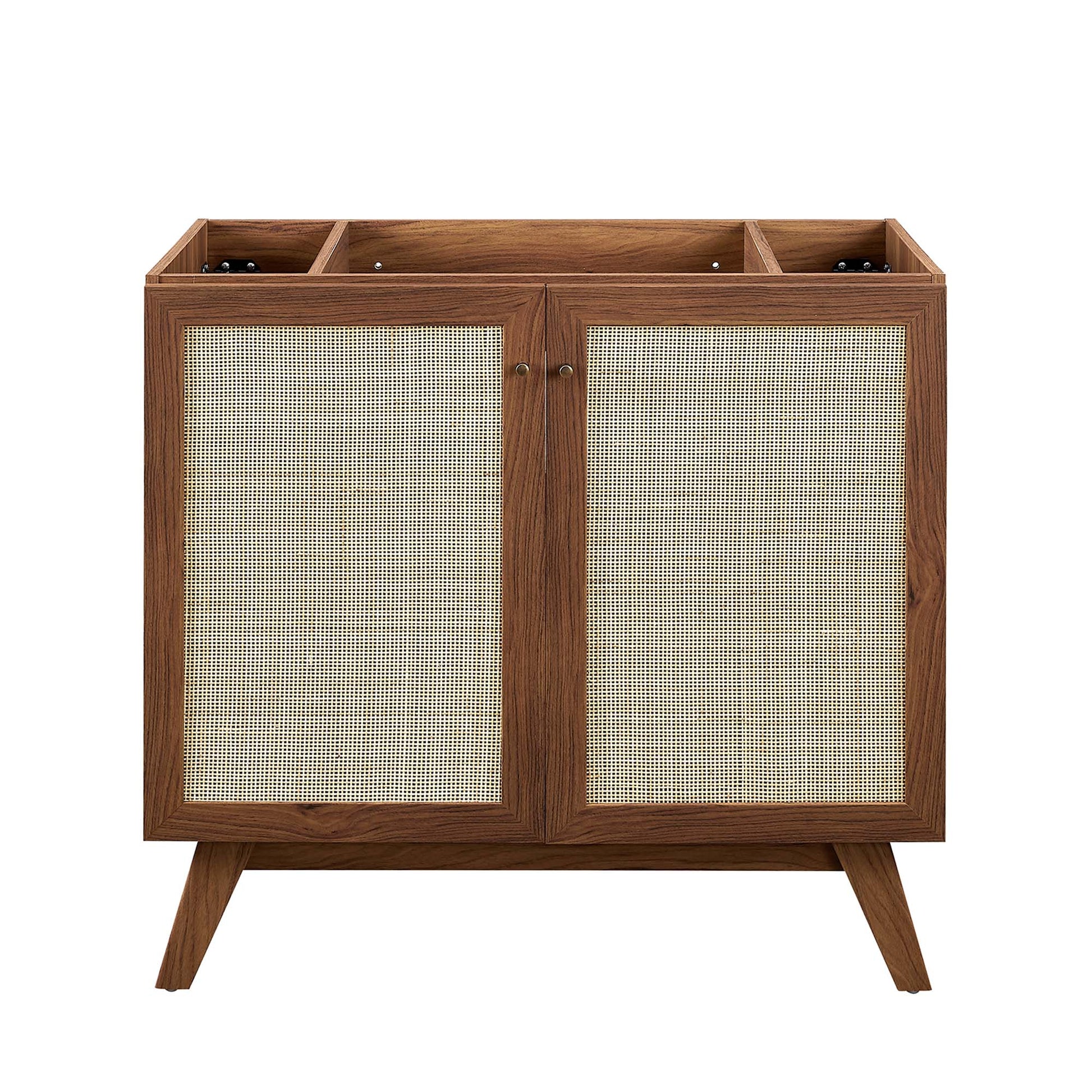 Introduce refreshing style to your restroom with the Soma 36" Bathroom Vanity Cabinet. Showcasing a beautiful rattan weave on the cupboard doors, this vanity cabinet brings organic aesthetics and modern functionality to any bathroom or powder room. Crafted from durable MDF and particleboard with a natural wood grain finish, this cabinet features an adjustable shelf, providing easy customization for arranging towels, toiletries, and bathroom necessities. Complete with metal doorknobs with a brushed gold finish and soft-close hinges, this bathroom vanity cabinet is designed for quiet and effortless functionality. Resting on splayed legs, the Soma Bathroom Vanity includes non-marking foot caps to protect flooring. Assembly required. Fixtures and sink basin not included. Weight Capacity: 200 lbs.