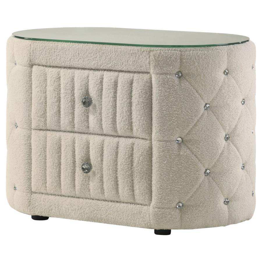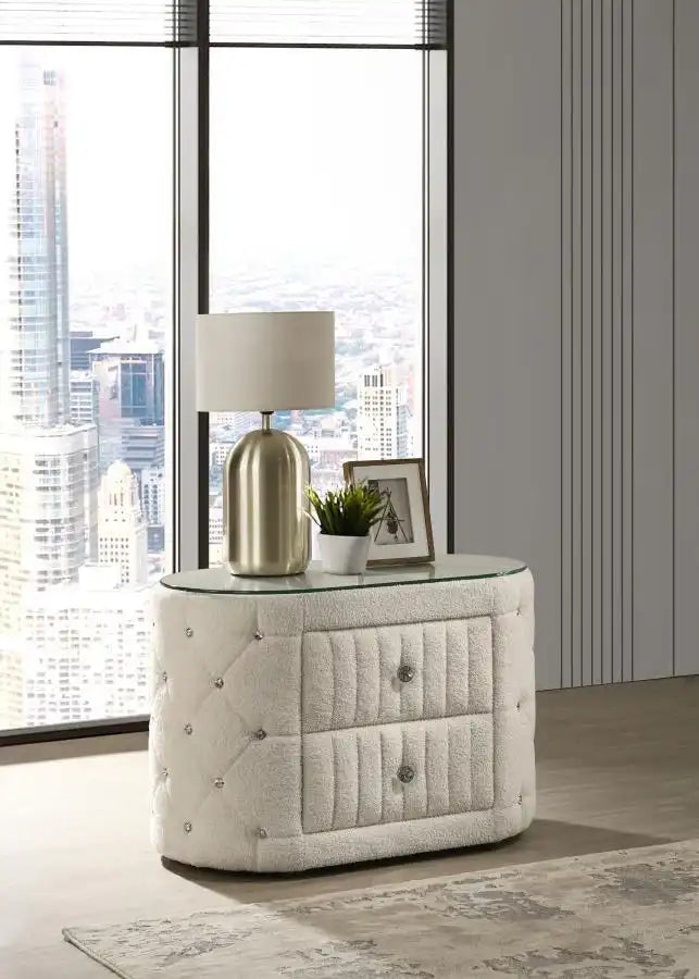 Add a touch of elegance and functionality to your bedroom with this stunning oval nightstand. The plush bouclé upholstery, adorned with sparkling acrylic button tufts, offers both a luxurious feel and eye-catching detail. Two spacious drawers provide ample storage for your essentials, while the clear tempered glass top adds a sleek and modern finish. The acrylic knobs complement the tufted design, bringing a cohesive and polished look to your space. Perfect for keeping your nighttime necessities close at hand, this nightstand effortlessly blends style and convenience.