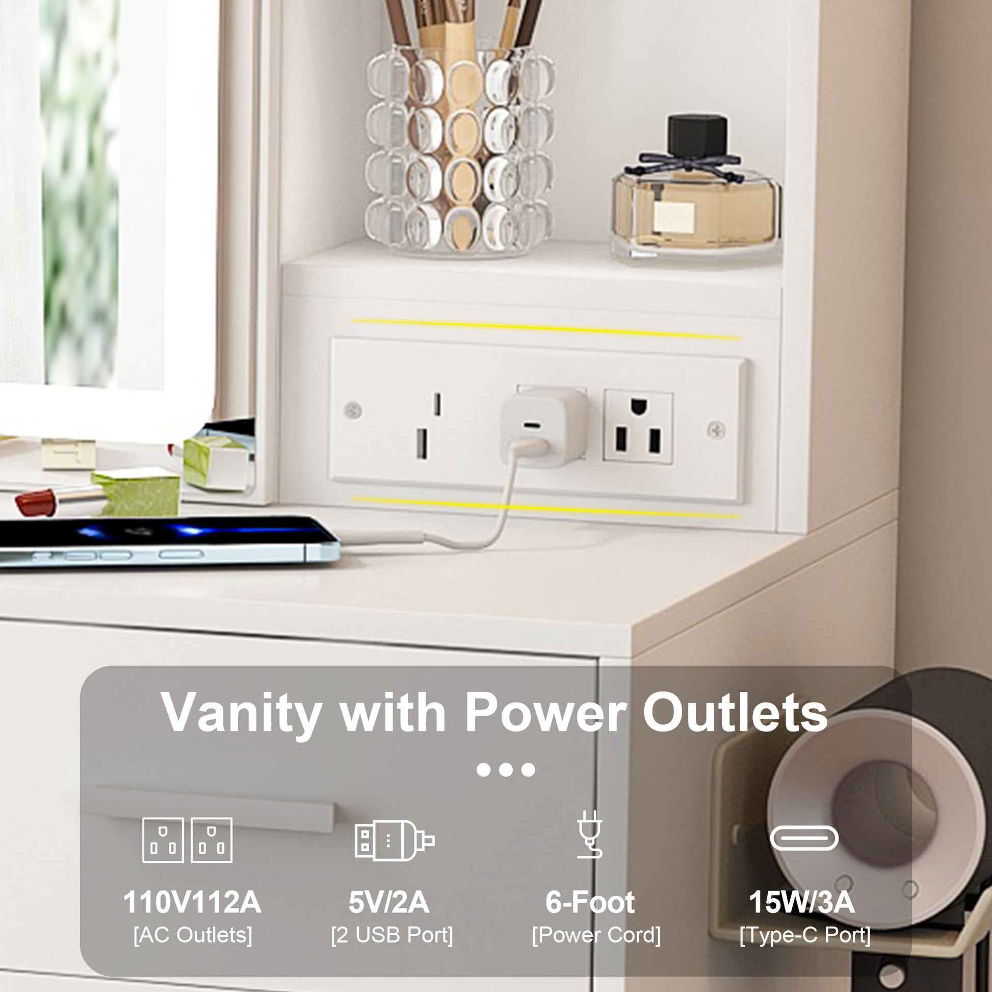 Space Saving Makeup Vanity Desk With Mirror & Adjustable Led Lights, Built-In Power Outlet, Hidden Storage, Includes Stool & Shelf - White