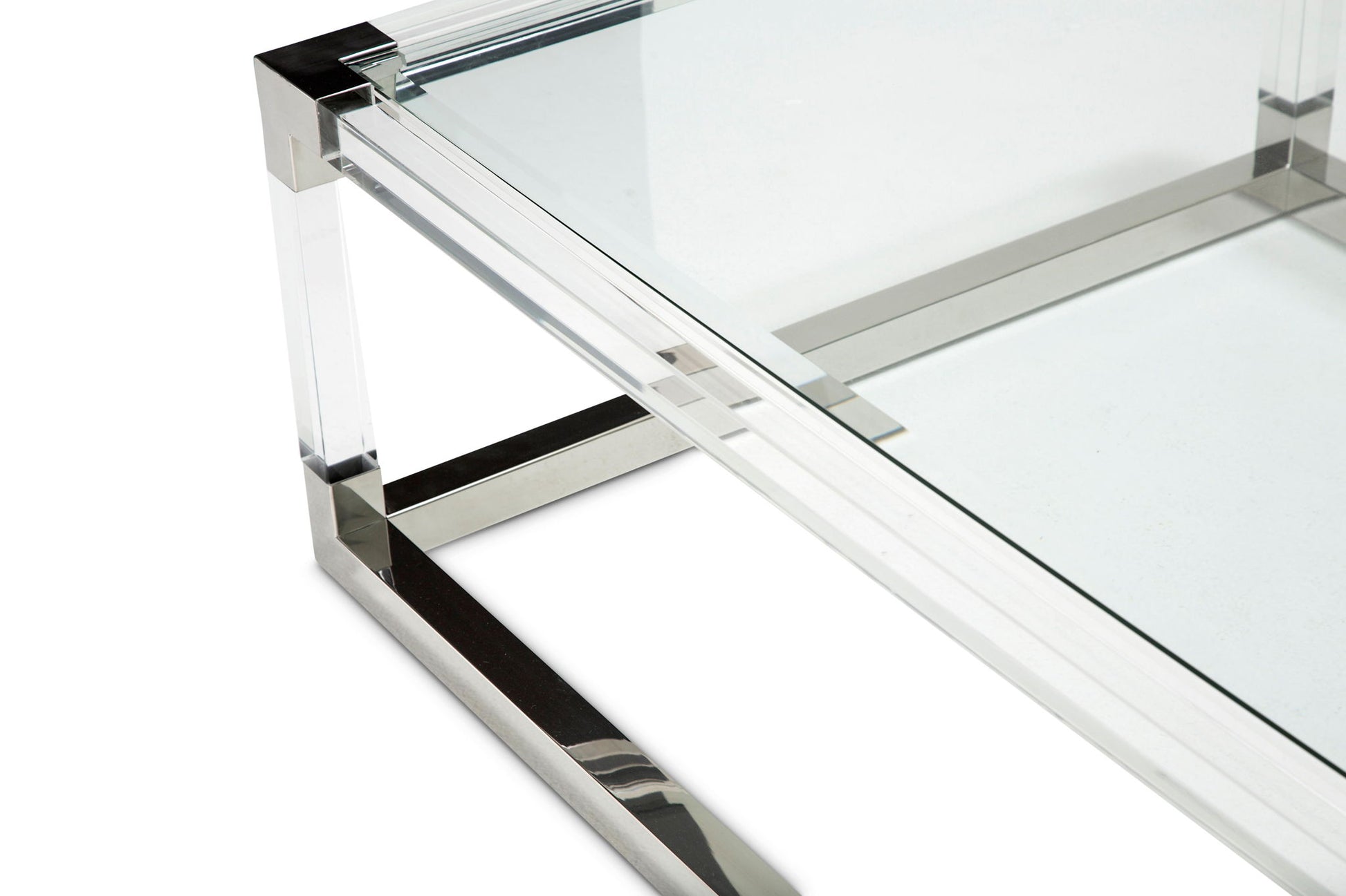 Brighten your living room instantly with the State St. Table. Glass, gleaming acrylic and stainless steel bring a soft glow guaranteed to meld with your home style. Acrylic trims and legs give this piece depth and sturdiness that creates a clean, lasting piece. Set your clear glass tabletop with your favorite centerpiece, and enjoy your stunning living room.