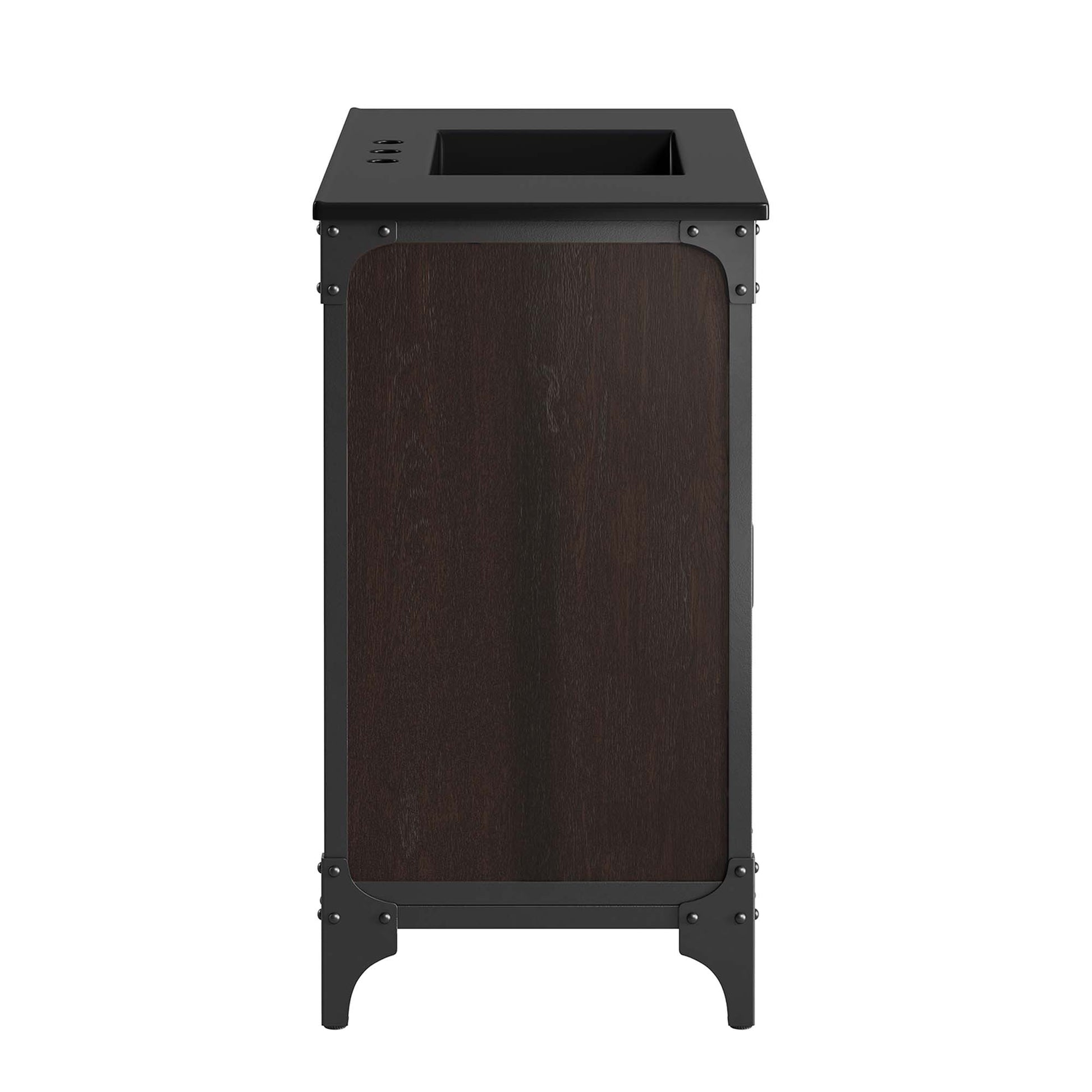 Experience the perfect blend of functionality and industrial modern style with the Steamforge 36" Bathroom Vanity. Crafted from sturdy metal with an antique patina and MDF with a beautiful wood grain veneer, this bathroom vanity cabinet brings a touch of utilitarian elegance to your bathroom decor. With a fixed drawer, pivot hinges on the double doors, and spacious shelving complete with a plumbing cutout, this vanity provides ample storage space for all your bathroom essentials. The ceramic sink basin boasts an integrated countertop with 8" widespread holes, ready for your chosen fixtures (not included). With non-marking foot pads to protect your flooring, this bathroom vanity offers the ideal balance of design and practicality.