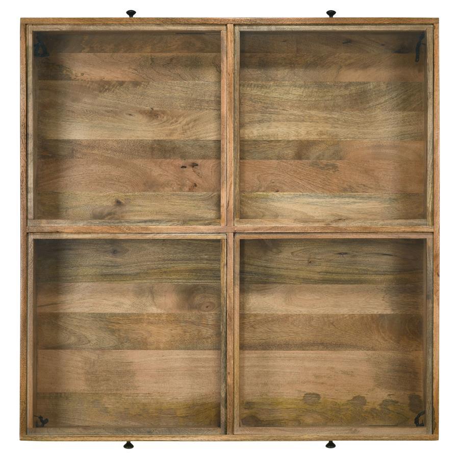 Bring farmhouse charm to your living room with this shadowbox coffee table. A tempered glass top offers a clear view of treasures stored in four compartments, accessed by drop-front doors with chain suspension for a unique touch. Crafted from solid mango wood in a warm honey brown finish, it exudes natural warmth. A sturdy iron base and black metal accents complete the mixed media look, making this table a personalized and functional focal point.