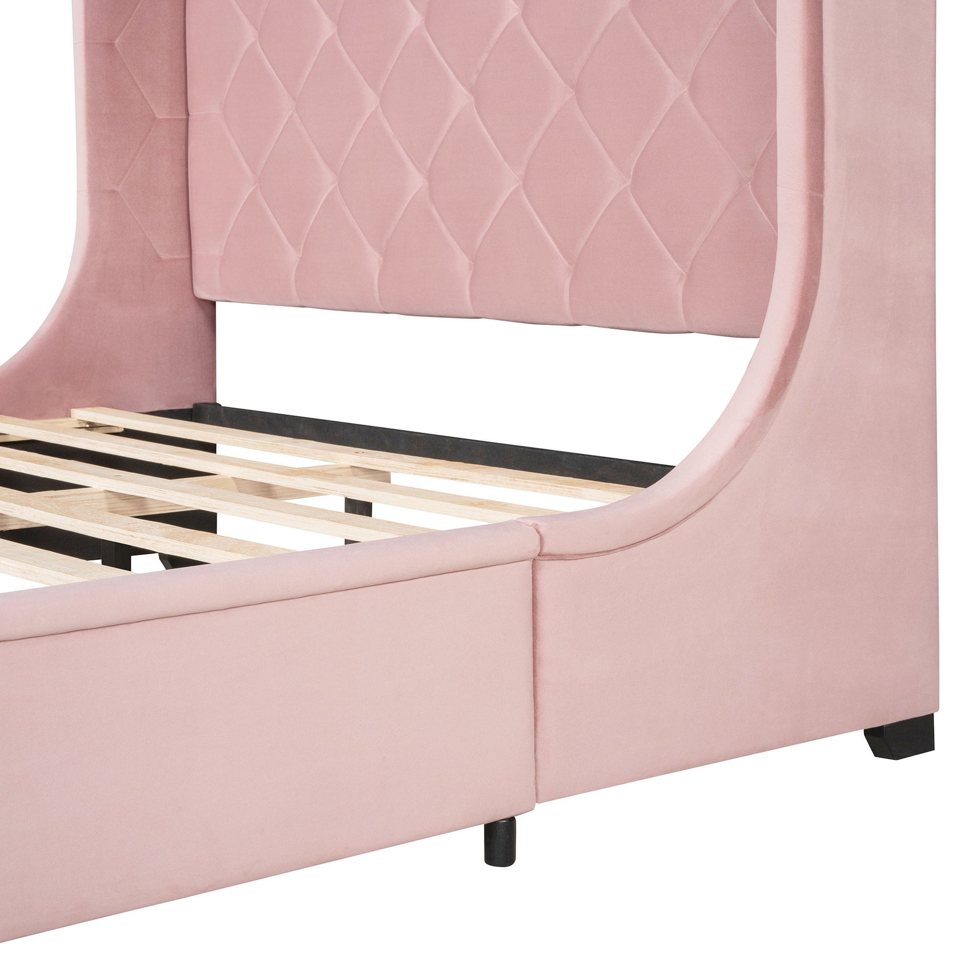 Queen Size Storage Upholstered Platform Bed With Wingback Headboard And A Big Drawer - Pink