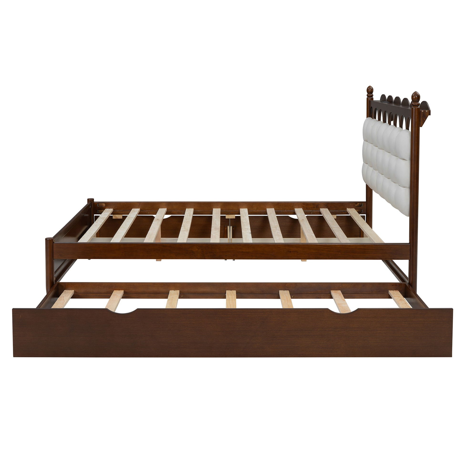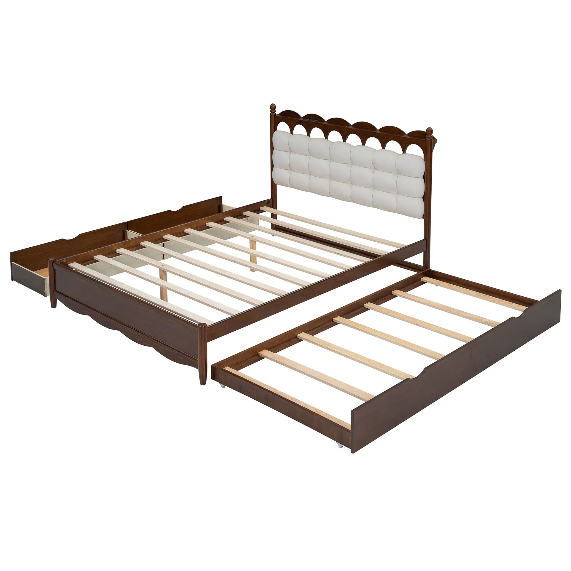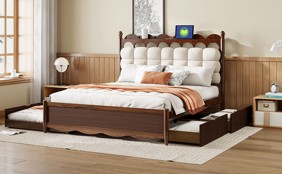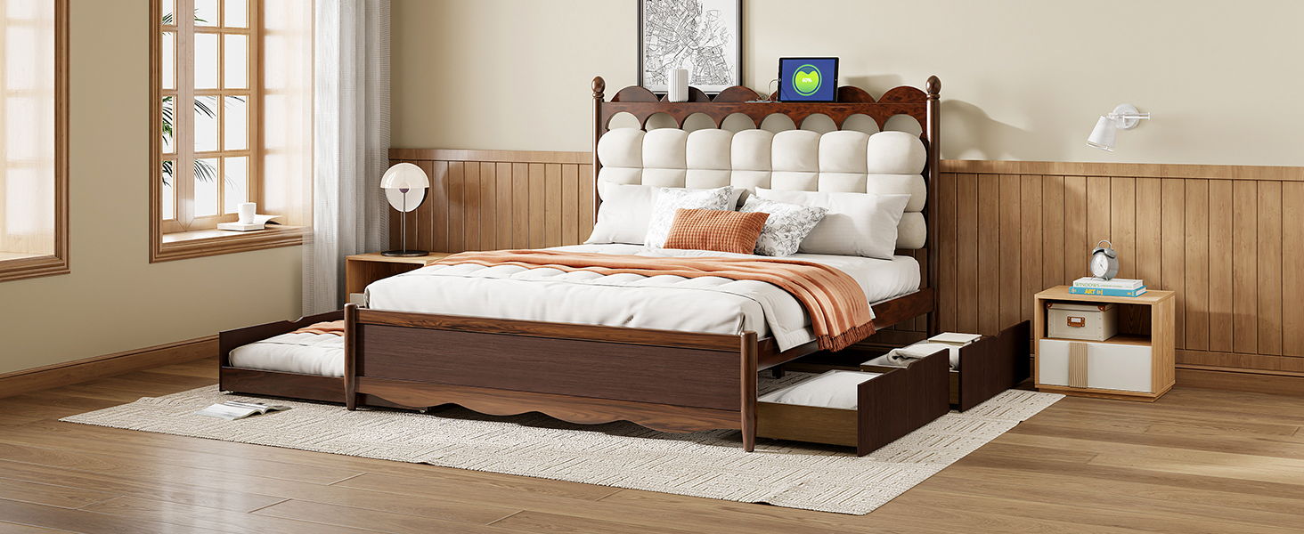 Queen Size Storage Platform Bed, With 2 Big Drawers, Twin Long Size Trundle, One Set Of Sockets & USB Ports - Walnut