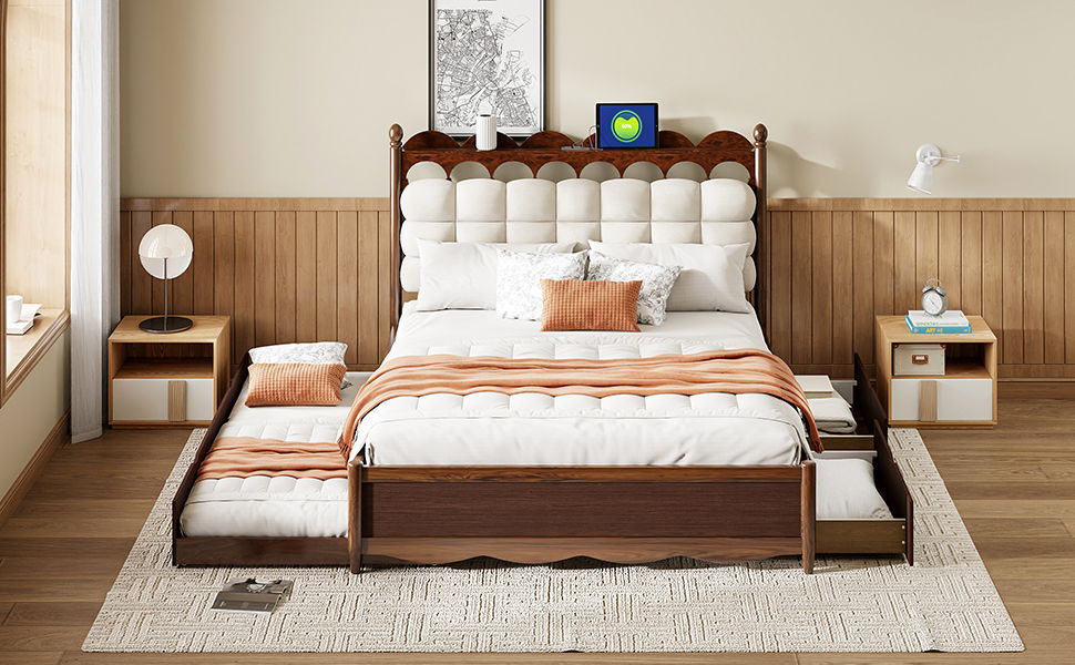 Storage Platform Bed, With 2 Big Drawers, Trundle, One Set Of Sockets & USB Ports