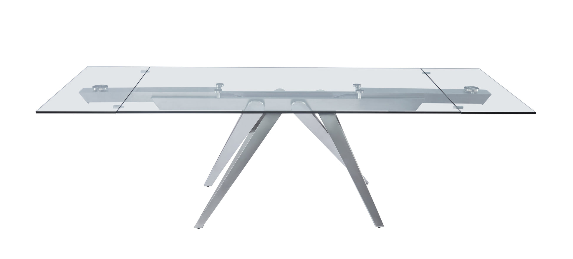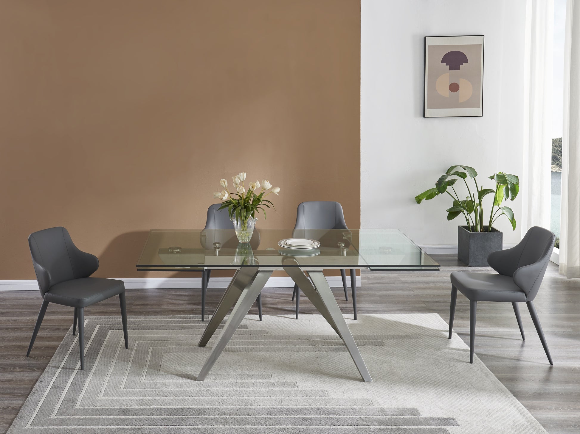 The J&M Strata Extension Dining Table perfectly captures the essence of modern luxury and smart functionality. Designed to impress, this statement piece features a tempered glass top supported by a distinctive steel-crafted base, combining strength and sophistication in one contemporary design.