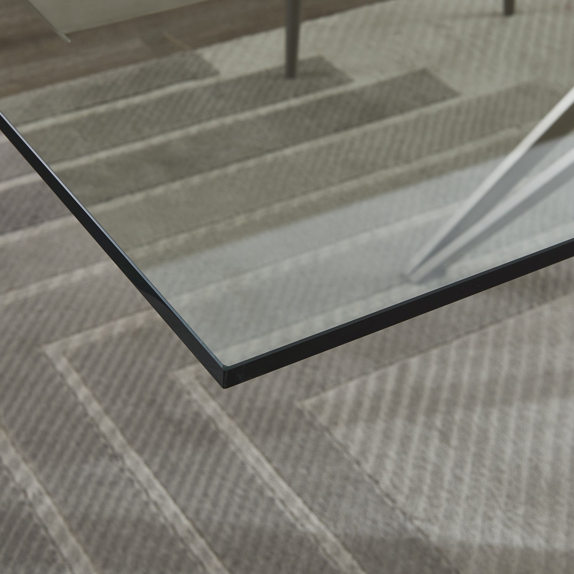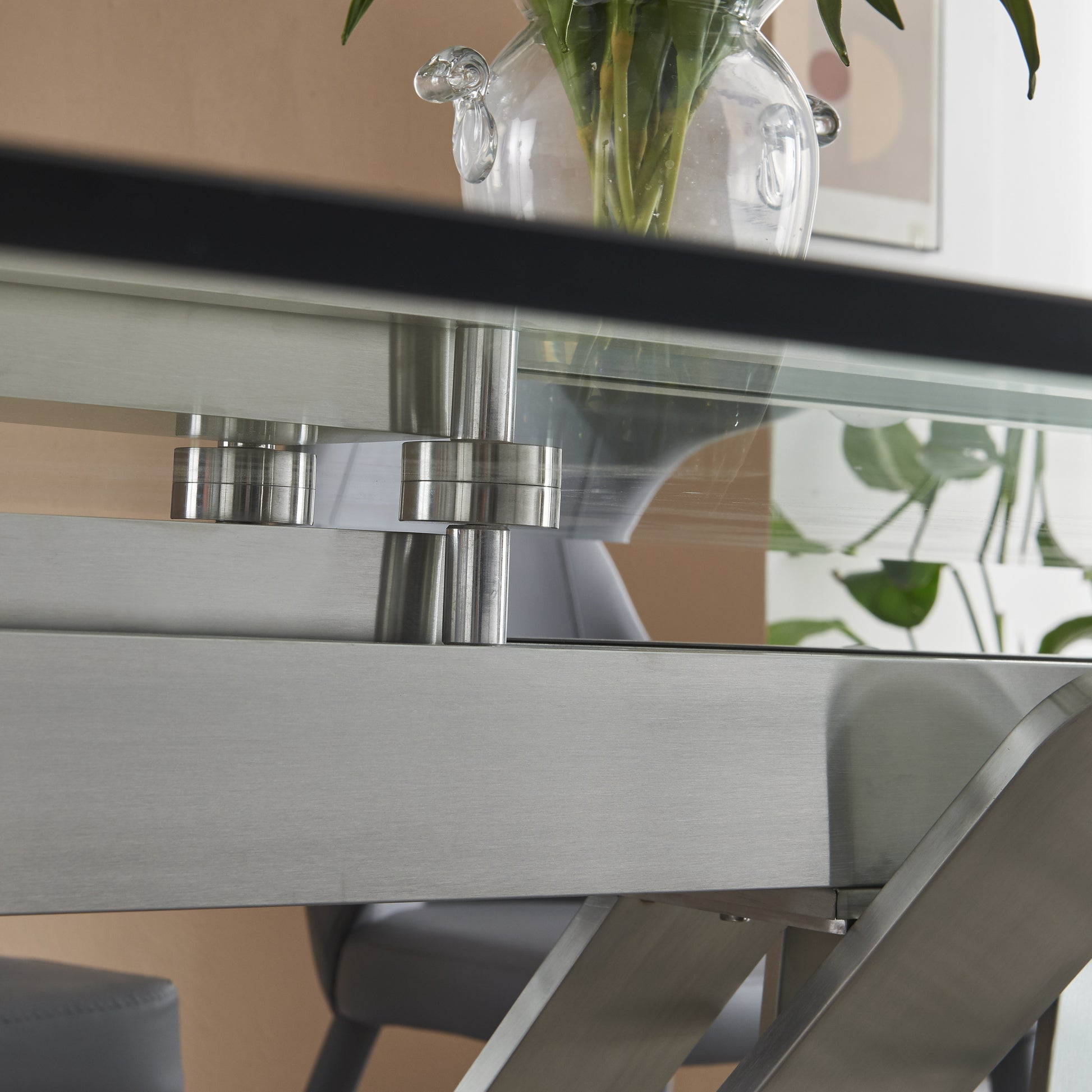 The unique architectural steel base adds an eye-catching geometric appeal, creating a striking contrast beneath the clear glass surface. Elegant, durable, and functional, the Strata Table elevates your dining space while maintaining a minimalist aesthetic that complements both modern and transitional interiors.
