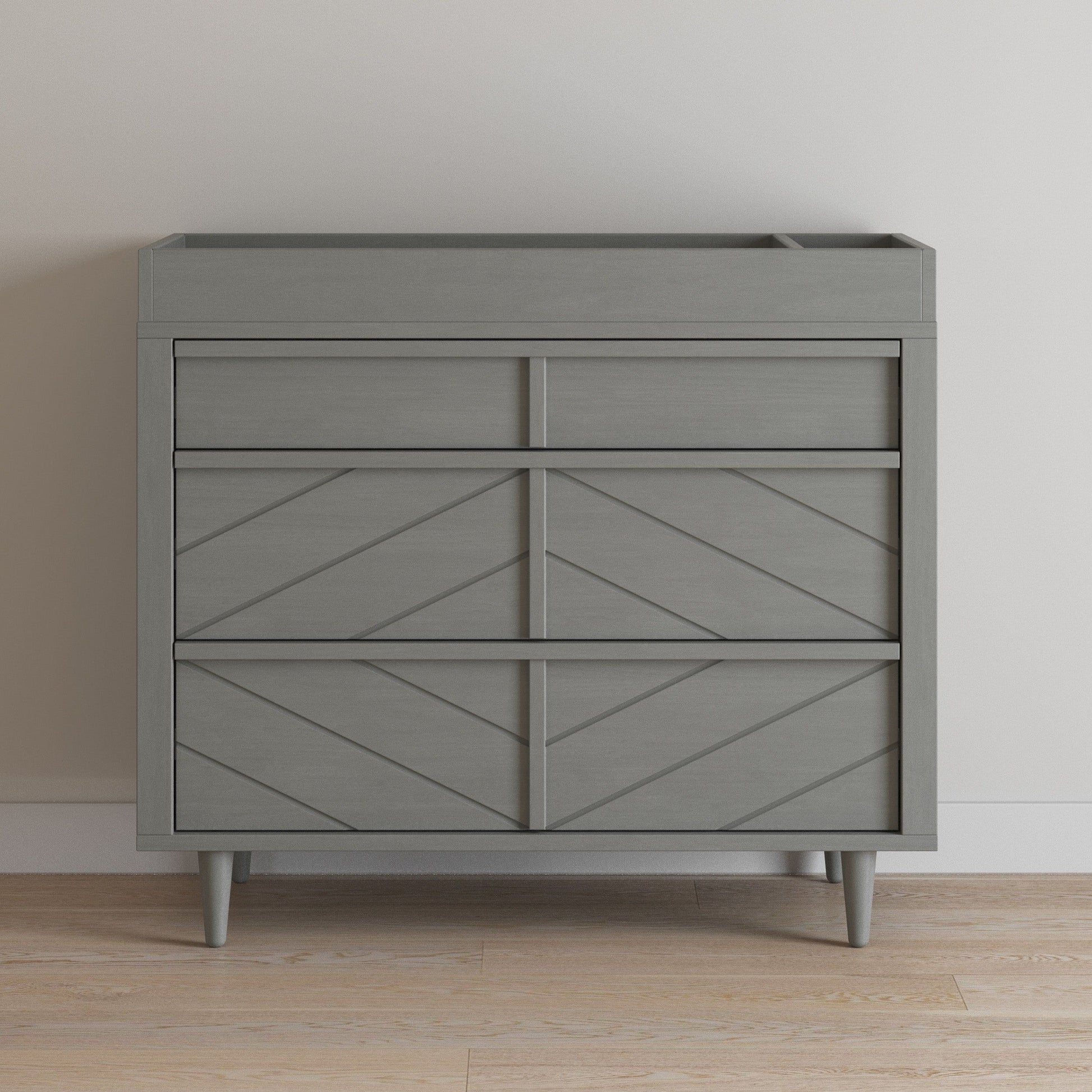 Transform your child's nursery into a stylish sanctuary with the Surrey Hill 3-Drawer Dresser from Halo Sleep. This striking piece showcases an exquisite design characterized by unique angled cuts that form a sophisticated diamond pattern across each drawer front. Crafted with meticulous attention to detail, its turned legs and minimalist wooden handle pulls evoke a contemporary elegance that seamlessly complements any decor, from nursery to guest bedroom. Available in two chic finishes, this dresser not only elevates your space but also pairs beautifully with other pieces from the Child Craft Surrey Hill collection for a coordinated look.
