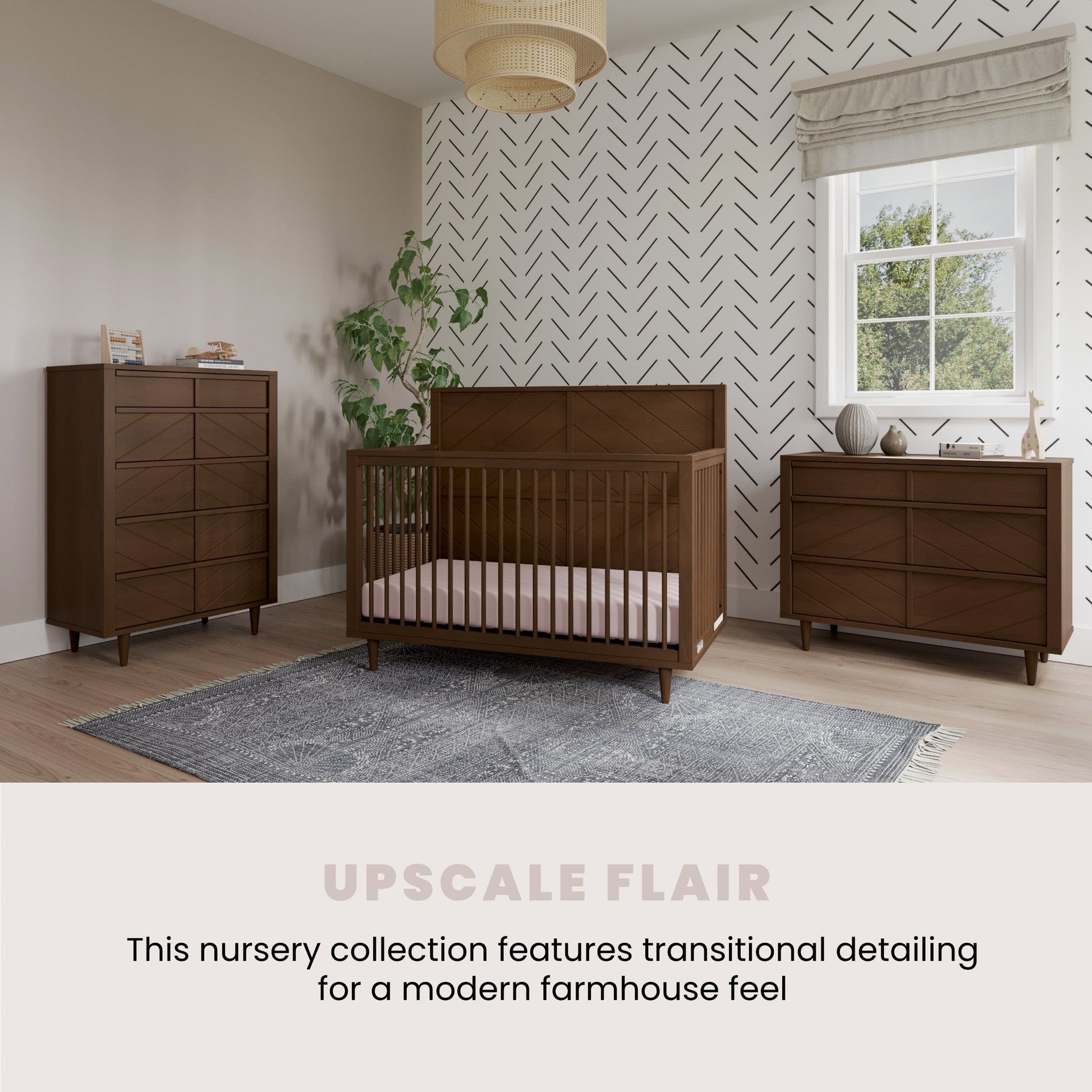 Elevate your baby's nursery with the exquisite Surrey Hill Collection, a harmonious blend of contemporary design and practical functionality. The centerpiece of this collection is the 4-in-1 convertible crib, distinguished by a subtle diamond pattern reflected in its elegant angled headboard, complemented by refined turned legs and graceful rounded spindles. The complete set includes a coordinating dresser and a five-drawer chest, all meticulously crafted from sturdy pine wood and veneers, ensuring durability while enhancing the nursery’s aesthetic appeal. Available in two modern finishes, this collection not only makes a striking visual statement but seamlessly integrates with other pieces from the Surrey Hill range.