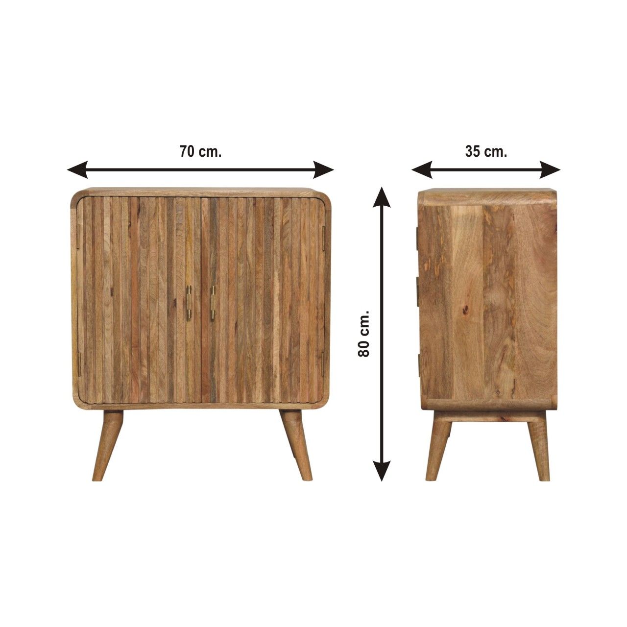 - Solid Wood T-bar Ridged Cabinet - This beautiful T-bar Ridged Cabinet has been constructed from 100% solid mango wood and has a lovely natural oak-ish finish. It has features such as t-bar handles on the doors, 2 handy shelves inside as well as 4 Nordic style legs for stability and a modern touch. Make full use of this piece in your living room by letting it store all your belongings while providing charm.