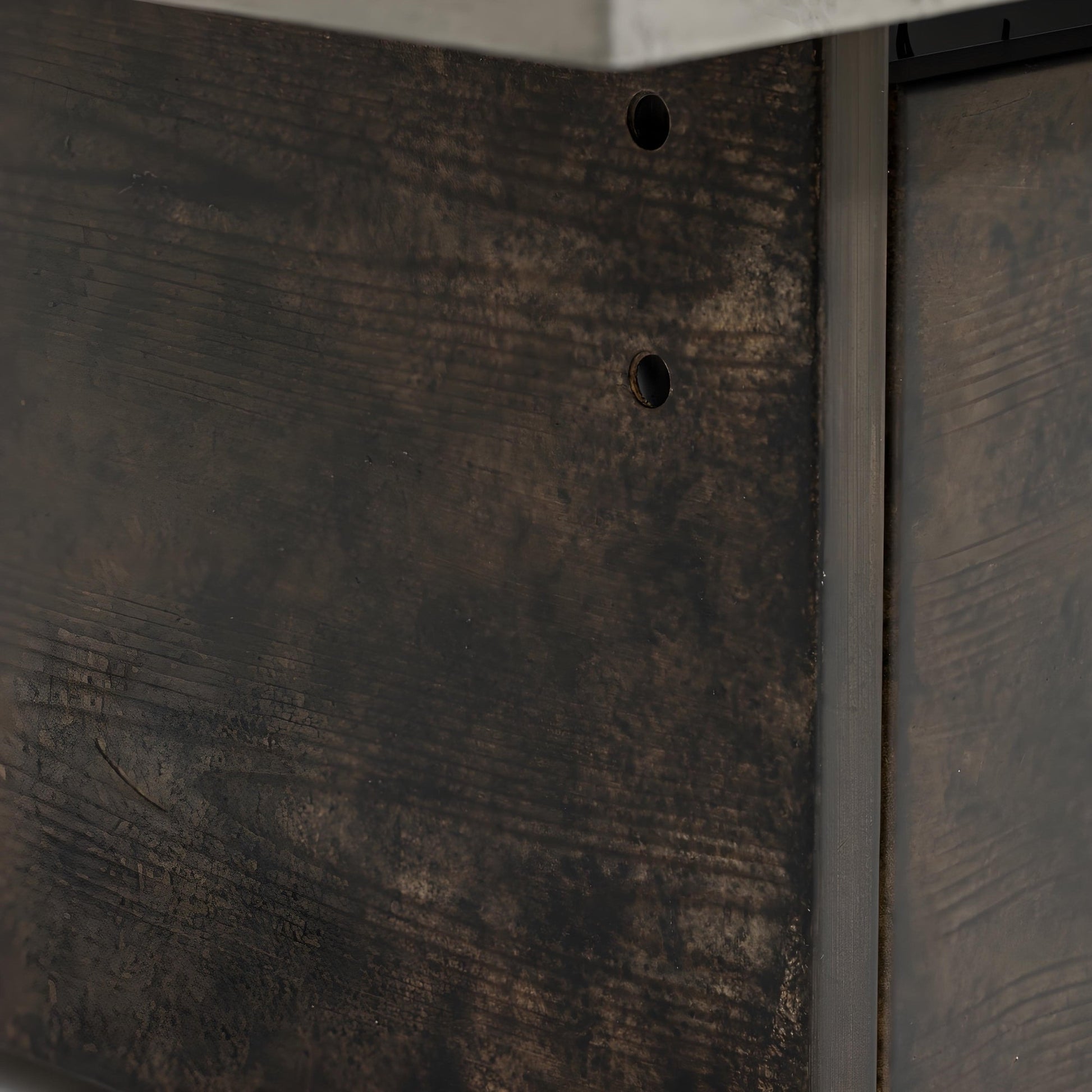 - Stylish cement-imitating textured surface paired with a vintage wood-grain iron base