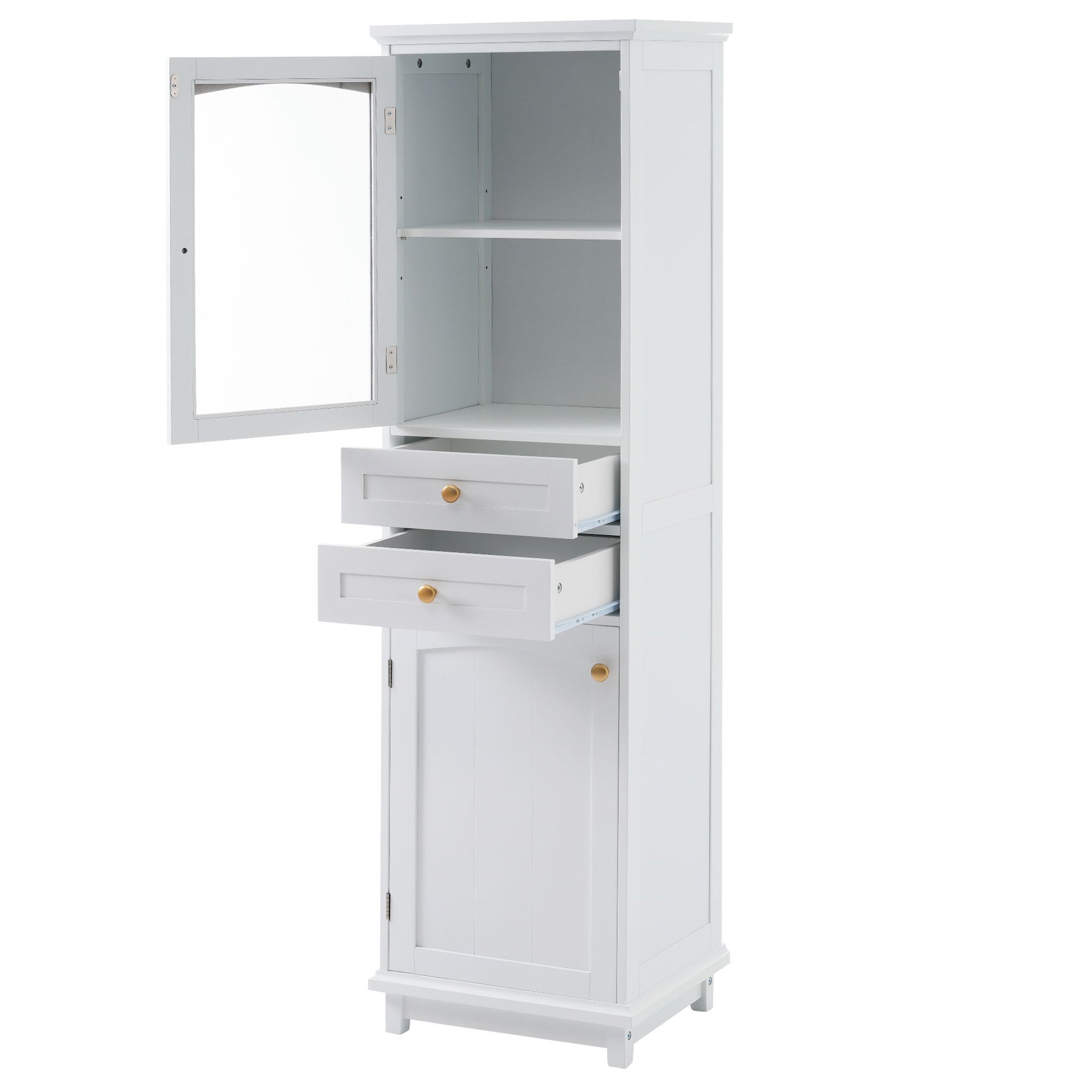 Tall Bathroom Storage Cabinet With Glass Doors, Free-Standing, Two Drawers, And Adjustable Shelves, MDF Board, Painted Perfect For Displaying Your Favorite Items - White