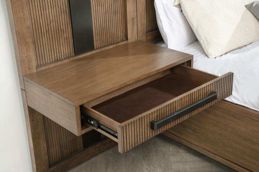 Expand your headboard with the wall panel design of a modern wooden nightstand. It blends seamlessly, perfectly complementing the matching headboard (not included) with vertical fluting and a dark center stripe. The wall panel is adorned with one slim drawer, creating a tabletop for a reading lamp and good book while providing interior storage for essentials. The drawer front is adorned with matching vertical fluting and includes a horizontal pull that creates definition. Add grand scale and sophistication to your refined bedroom ensemble.