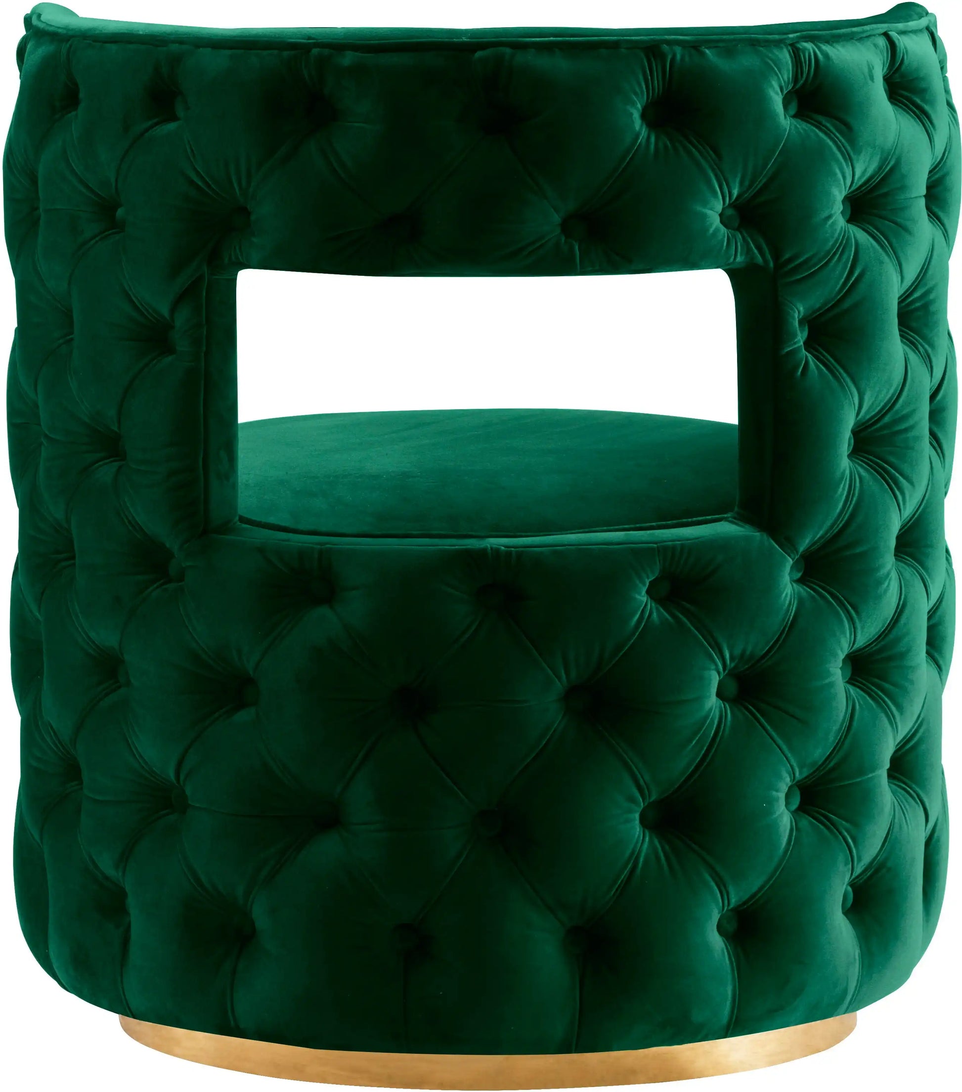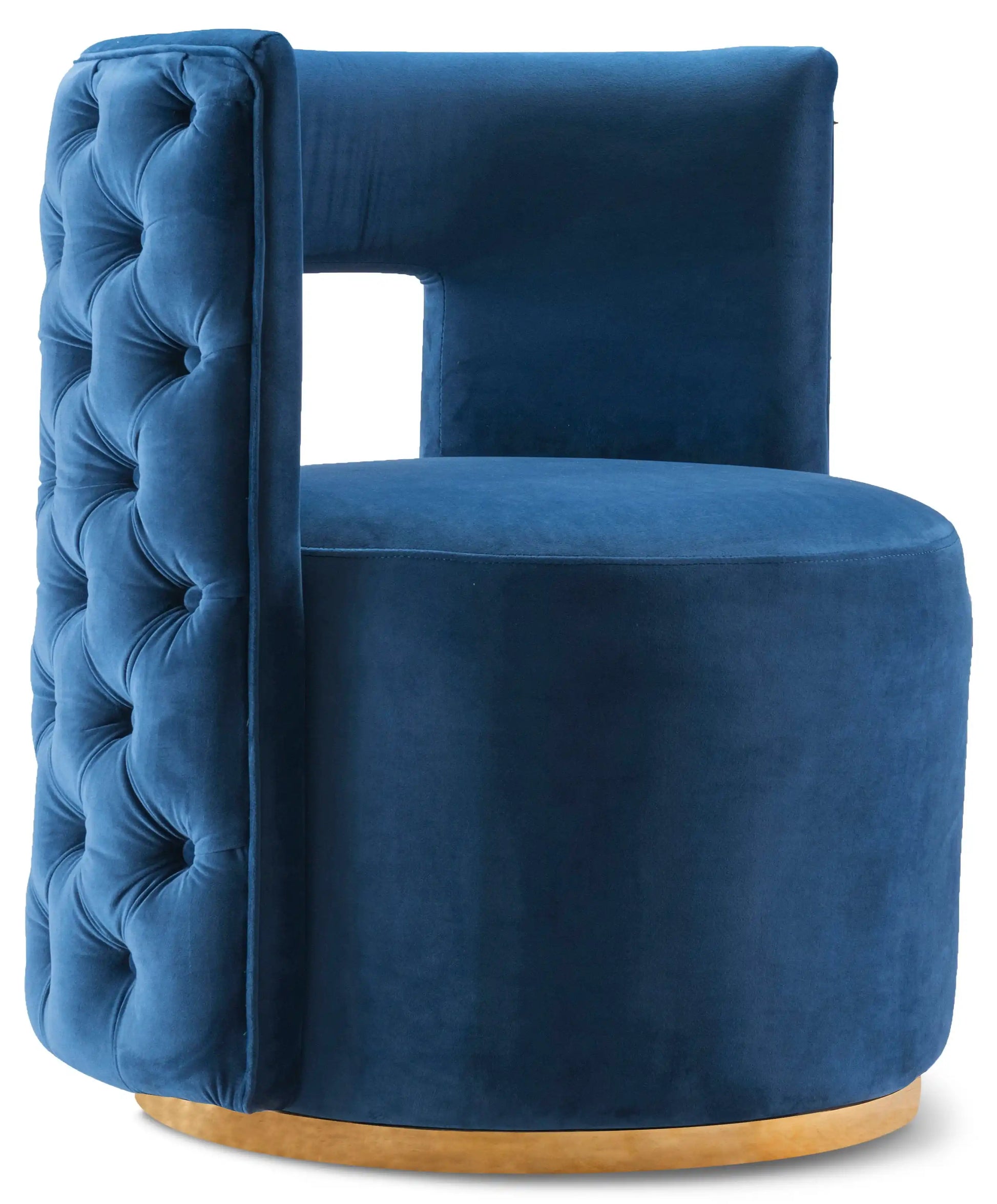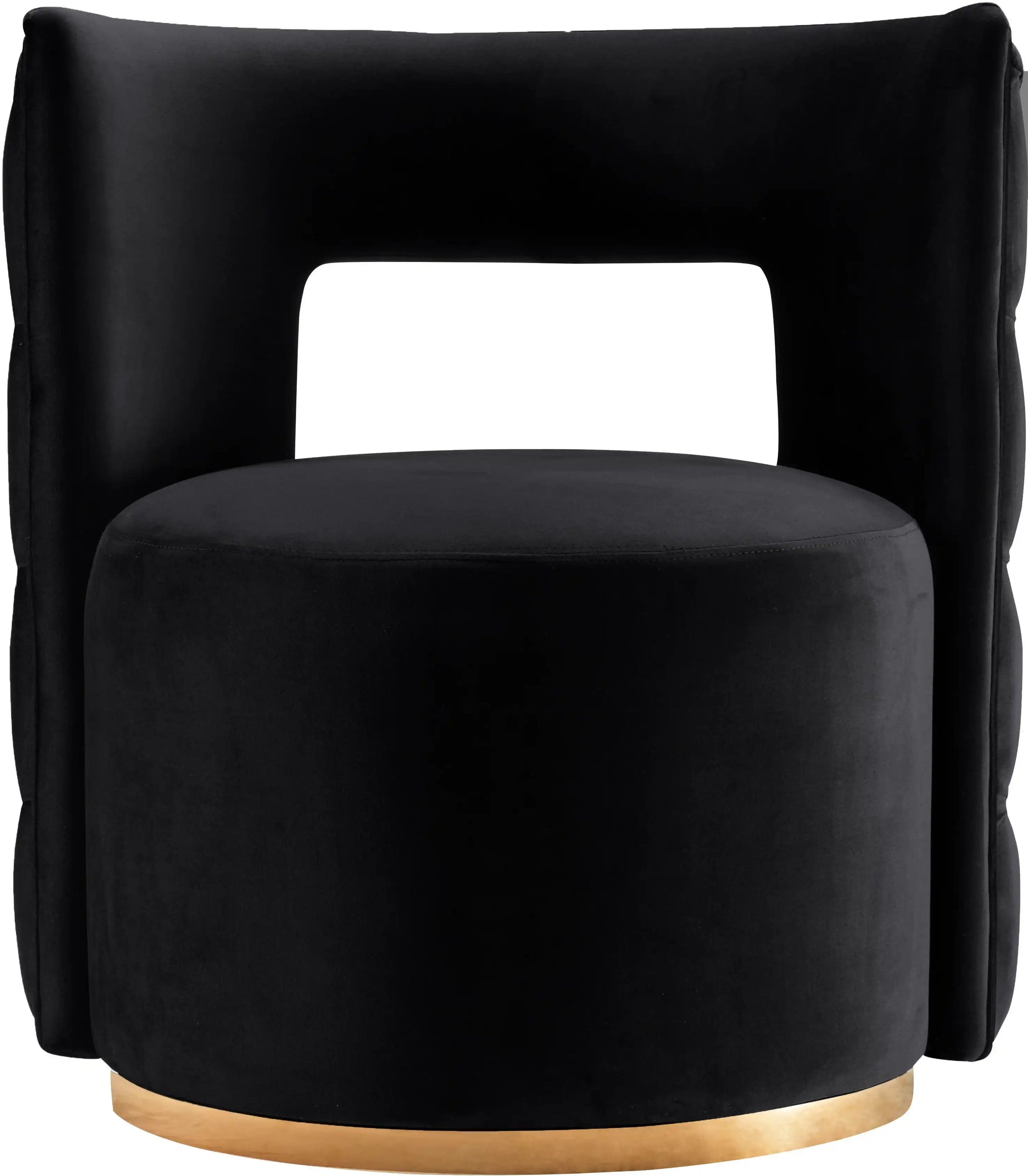 Complement your contemporary decor with this Theo Accent Chair from Meridian Furniture. Featuring a contemporary design with button tufting on the back, this chair is sure to immediately draw the eyes of all who enter your home. velvet upholstery makes this chair luxurious to sit in, and the opening in its back ensures ample air flow while you curl up with your favorite book or in front of the TV. Its swivel base accentuates its velvety dark color, while allowing you to turn whichever way you choose as you recline.