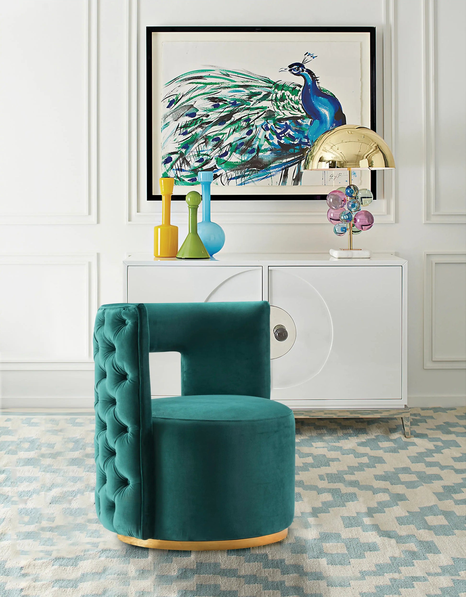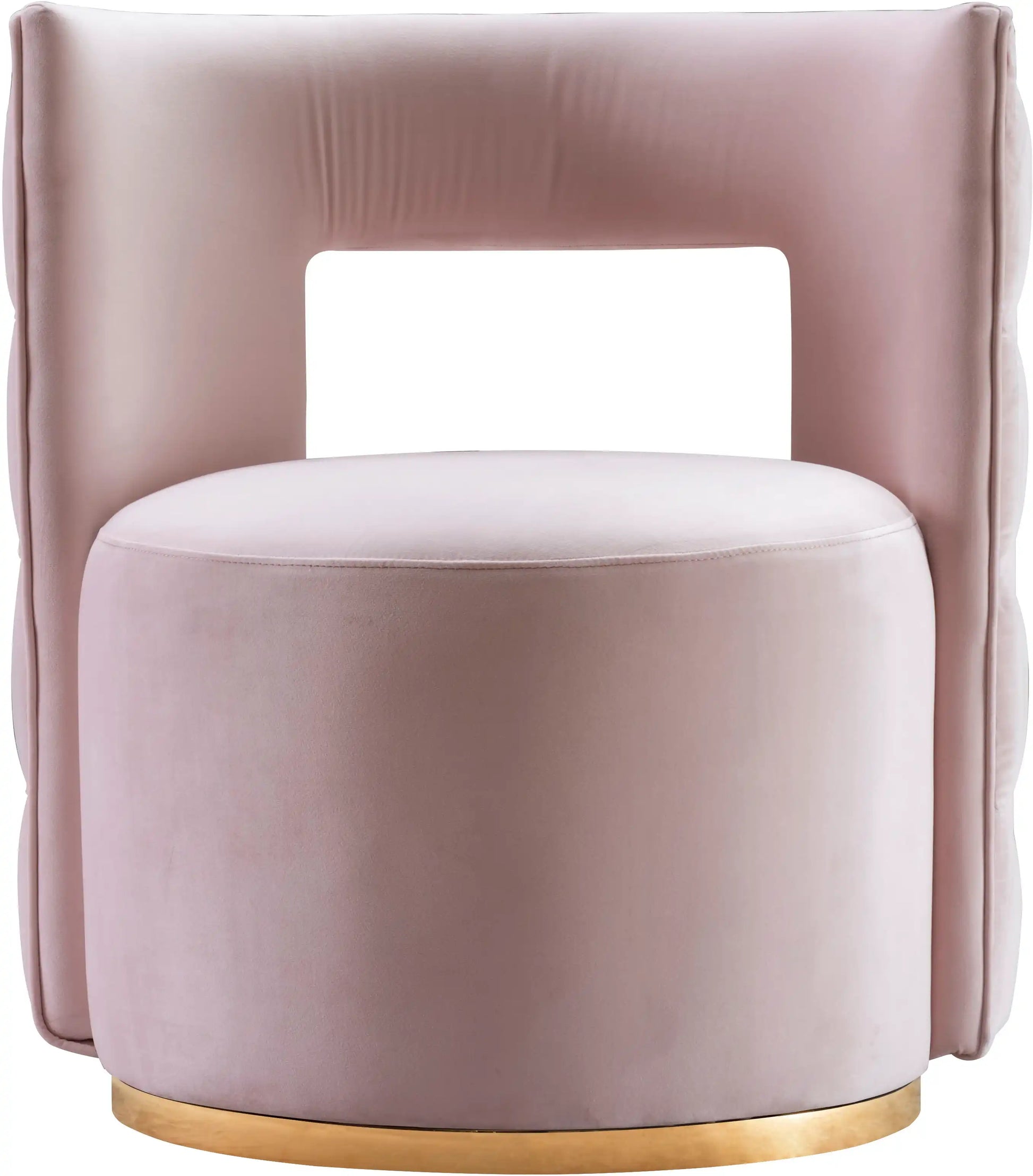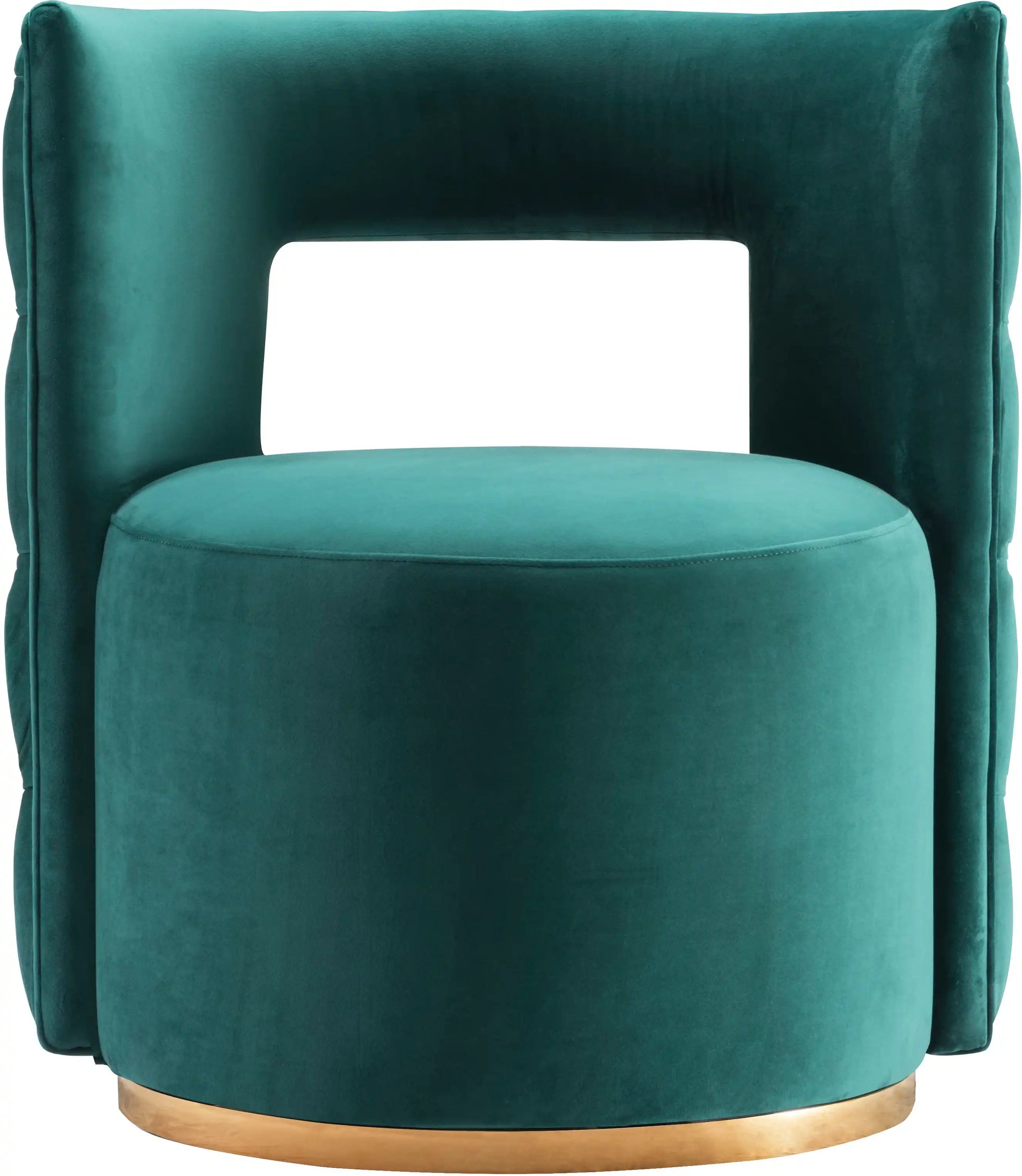 Complement your contemporary decor with this Theo Accent Chair from Meridian Furniture. Featuring a contemporary design with button tufting on the back, this chair is sure to immediately draw the eyes of all who enter your home. velvet upholstery makes this chair luxurious to sit in, and the opening in its back ensures ample air flow while you curl up with your favorite book or in front of the TV. Its swivel base accentuates its velvety dark color, while allowing you to turn whichever way you choose as you recline.