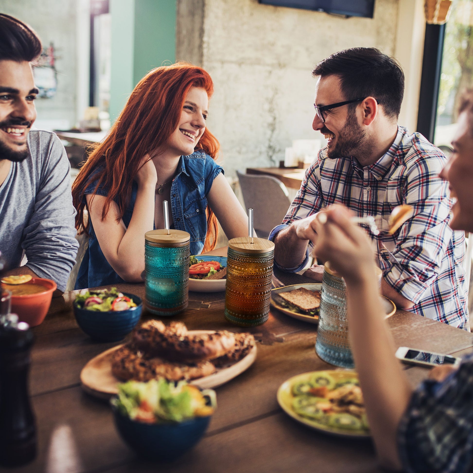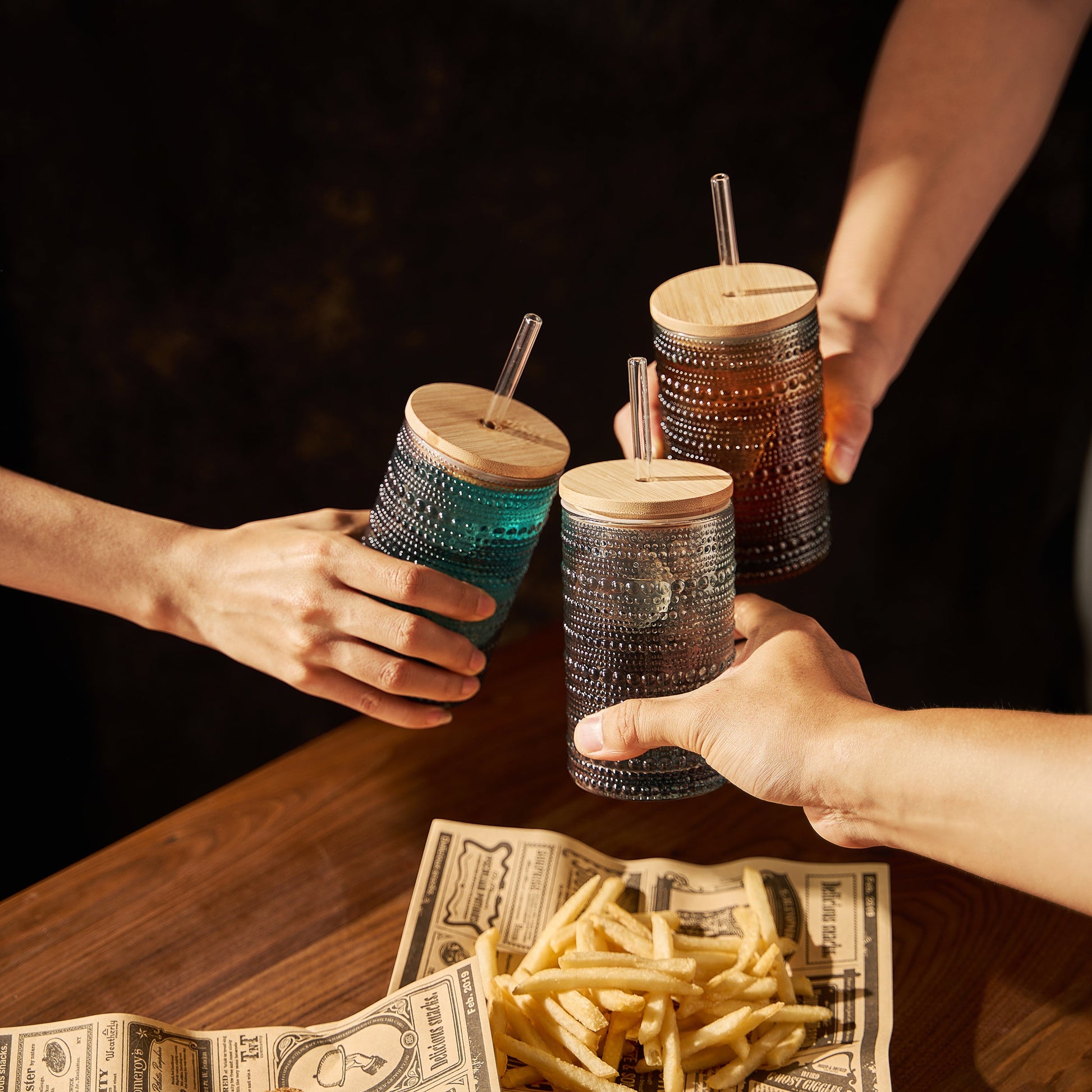 Tonal Hobnail Highball Glassware, With 6X Lids & Glass Straws, Set of 6