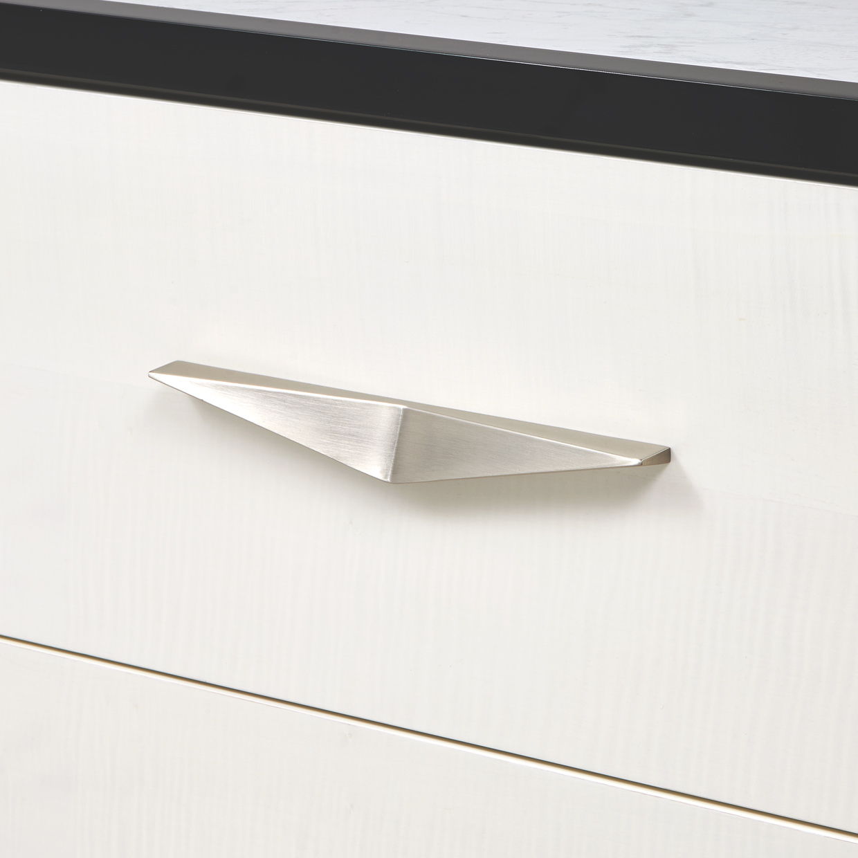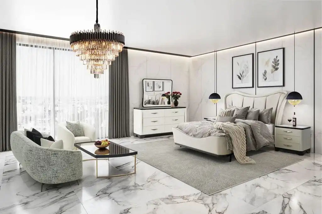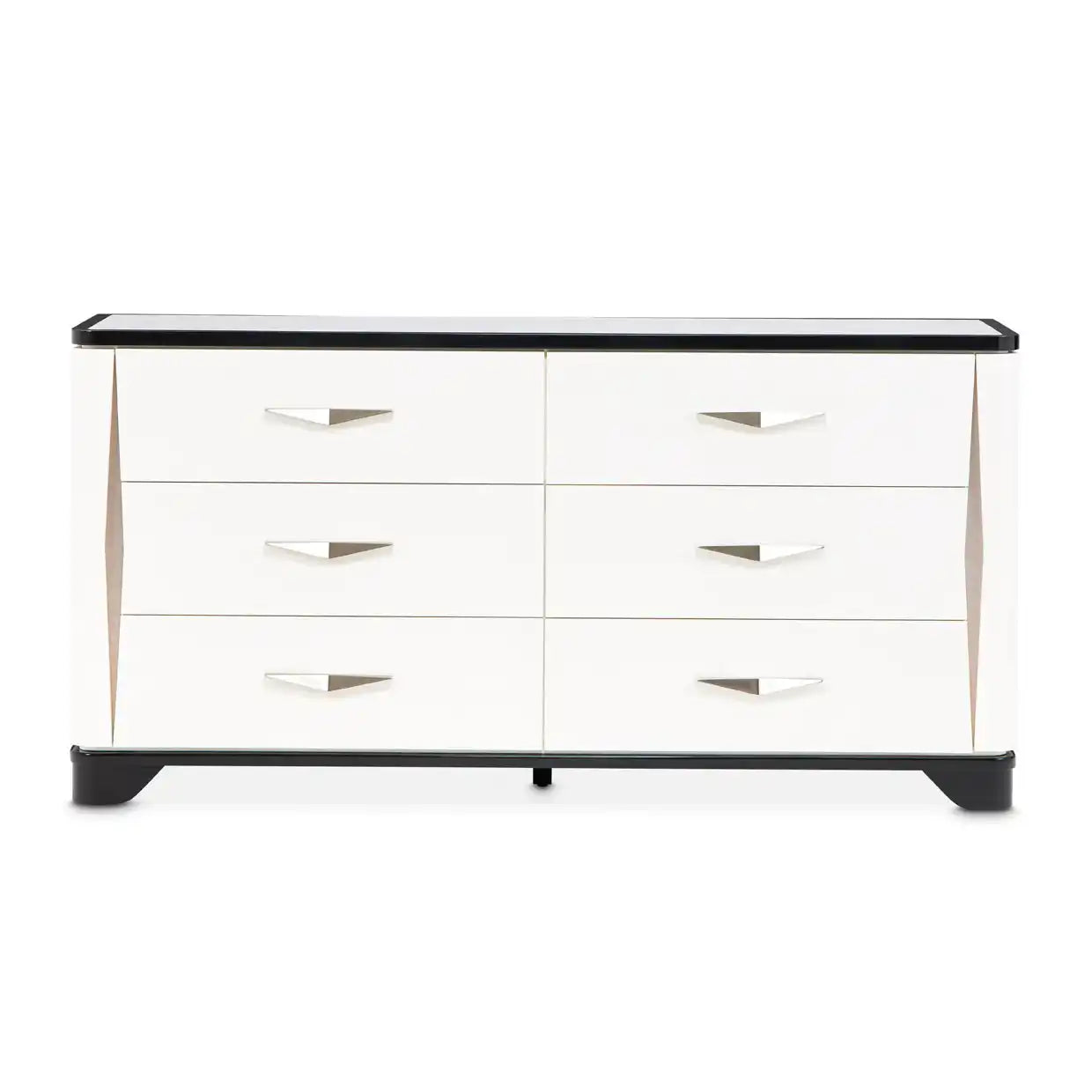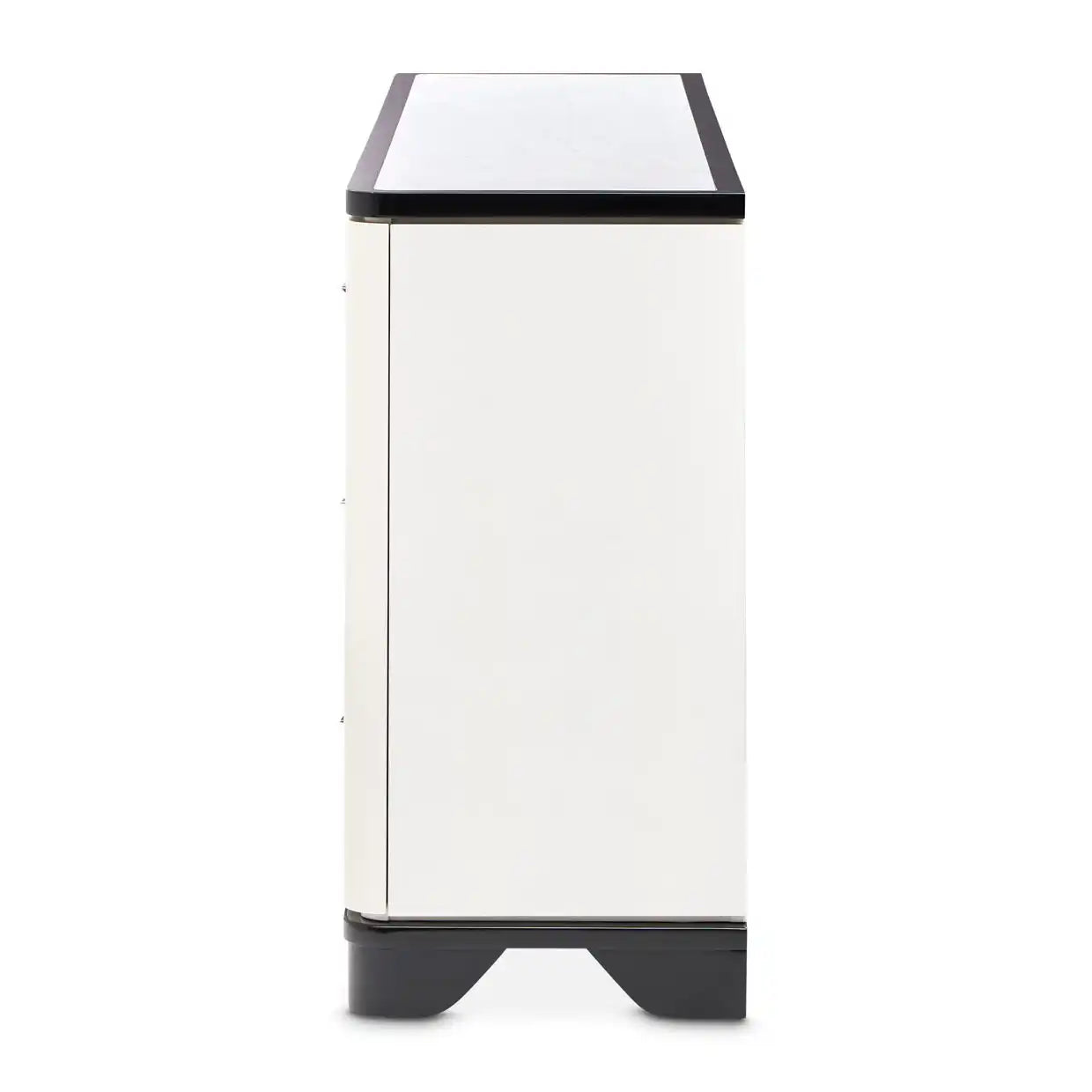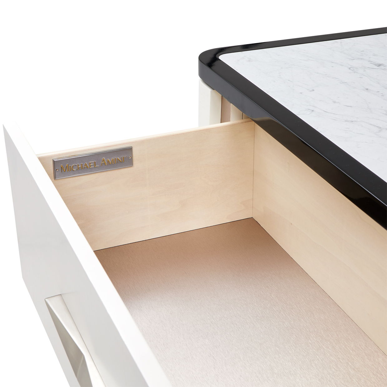 Organize your wardrobe within the opulent confines of the Tuxedo Dresser. Its surface, adorned with a rich marble inlay, sits atop spacious, soft-closing drawers that reflect a life style of meticulous elegance. Crafted with white anigre veneer and accented with stainless steel pulls, this dresser stands not merely as storage but as a beacon of luxury in your personal sanctuary