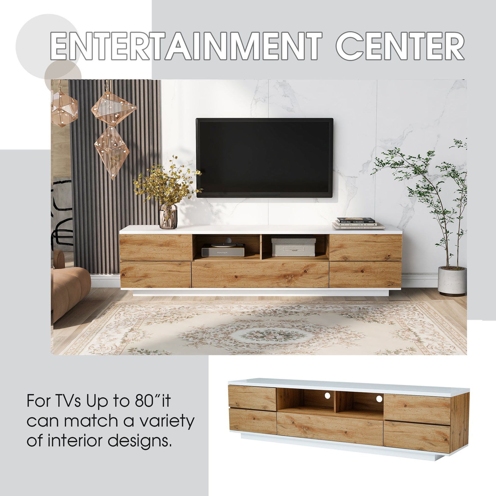 TV Stand, Entertainment Center With Deep Drawers, Cable Management & Soft Closing Hinges