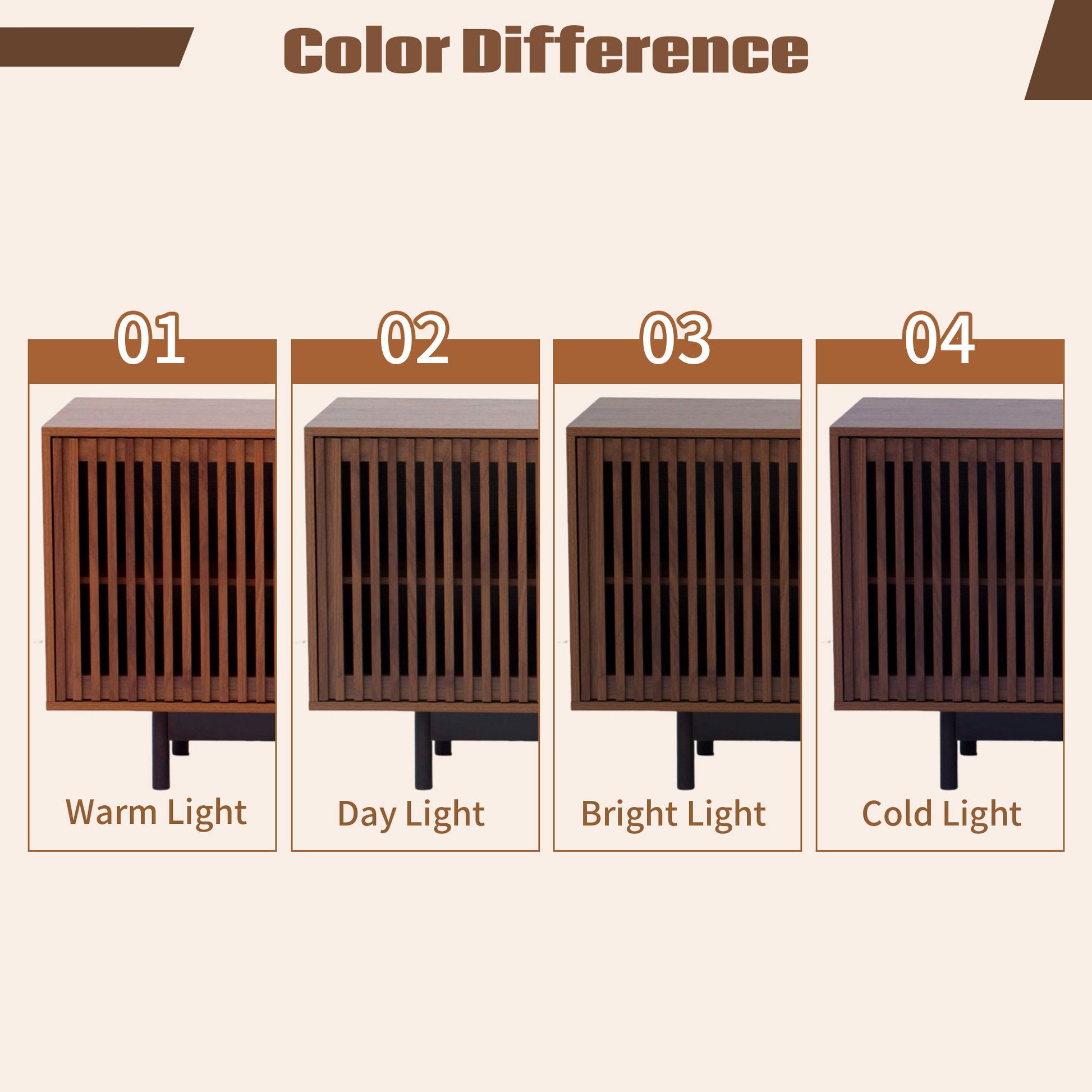 - Elegant Modern Form: Warm walnut finish with natural wood grain and slatted doors create a refined, light-diffusing design that enhances any living space.