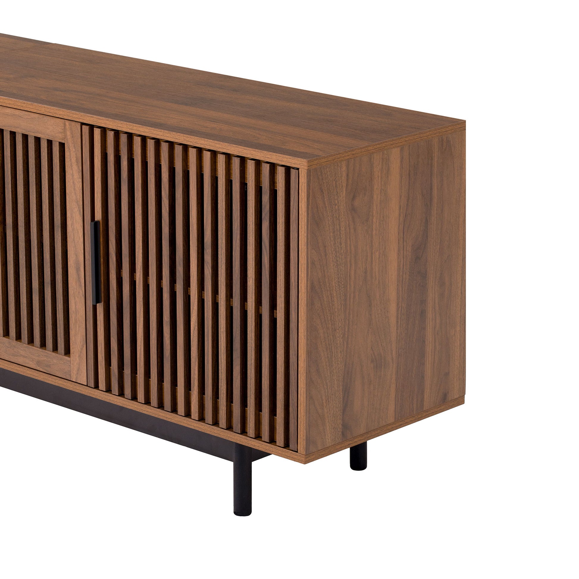 - Organized Entertainment Hub: Slatted cabinet doors offer concealed storage, combining visual texture with ample space to manage media and accessories.