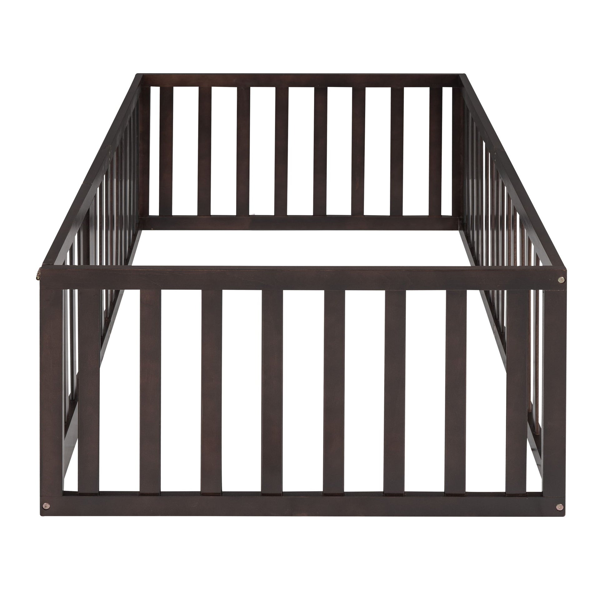 Twin Size Floor Bed Frame With Fence And Door - Walnut
