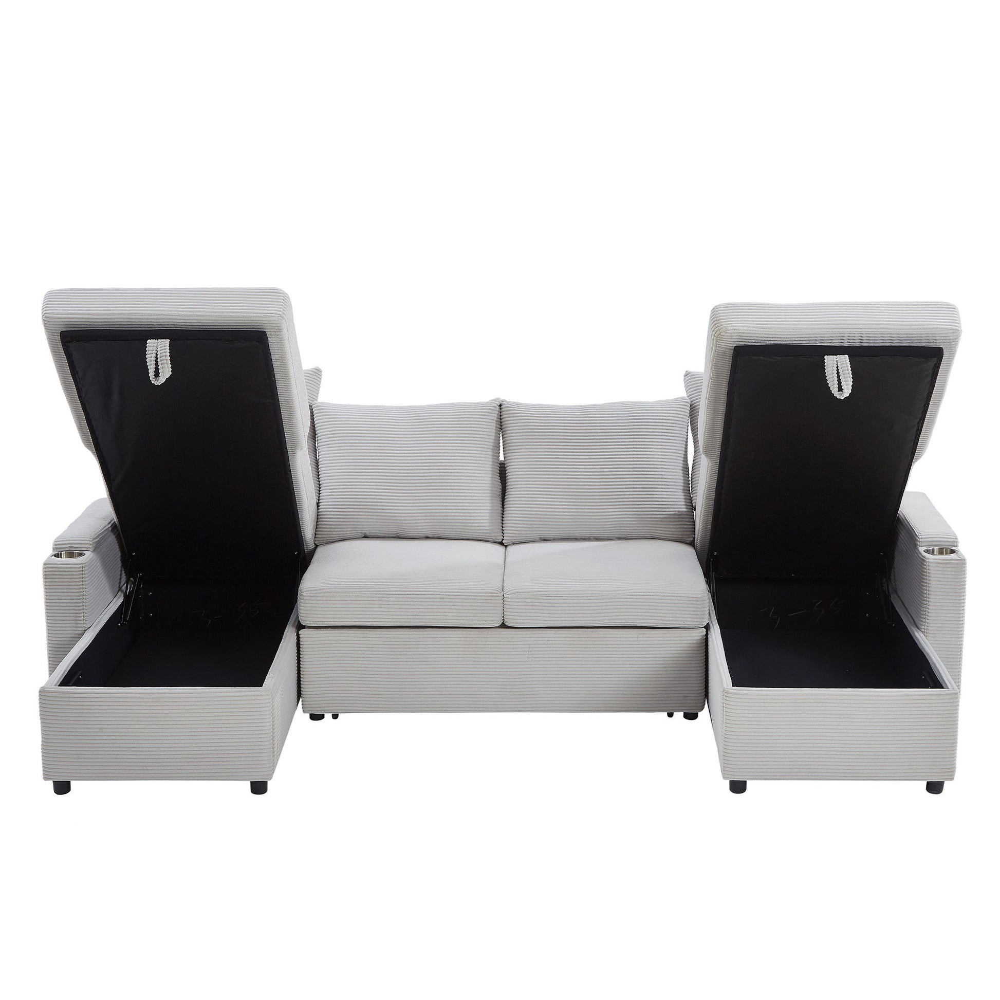 U Shaped Sectional Sofa Bed With Storage Chaise Lounges, Cup Holders, USB Ports, And Hidden Compartments - Gray
