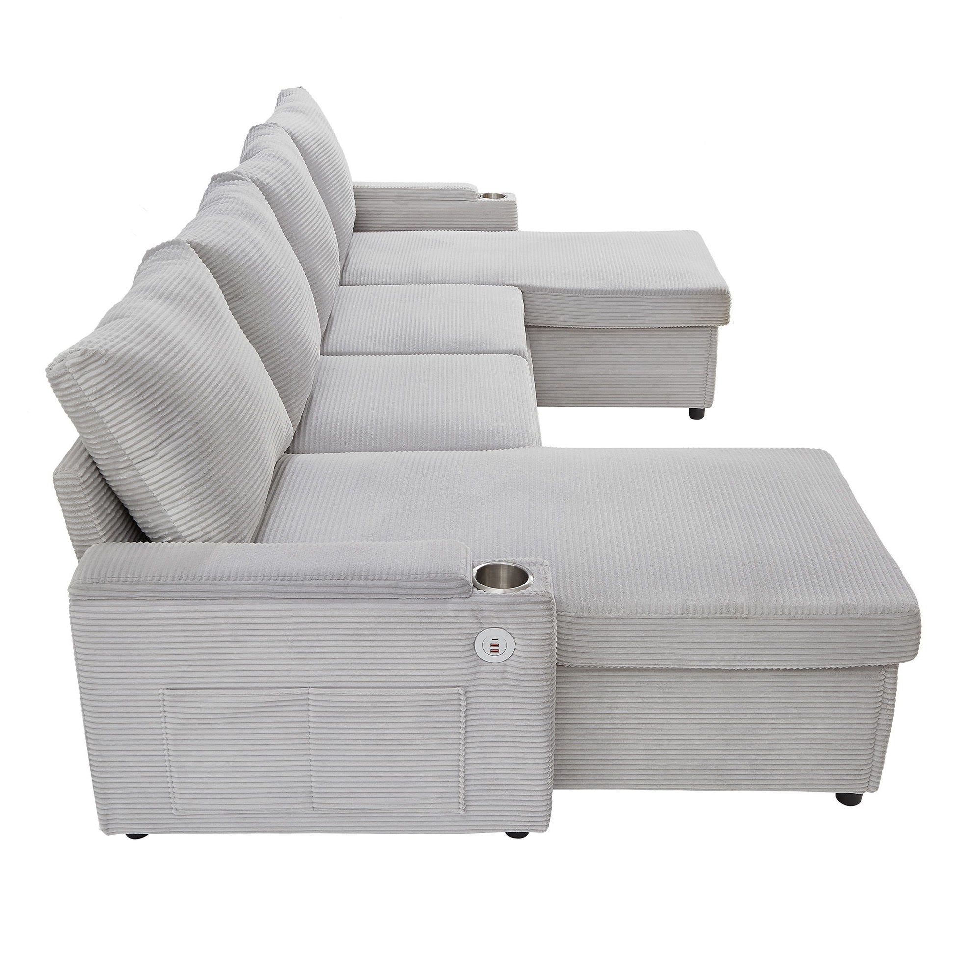 U Shaped Sectional Sofa Bed With Storage Chaise Lounges, USB Ports, And Cup Holders