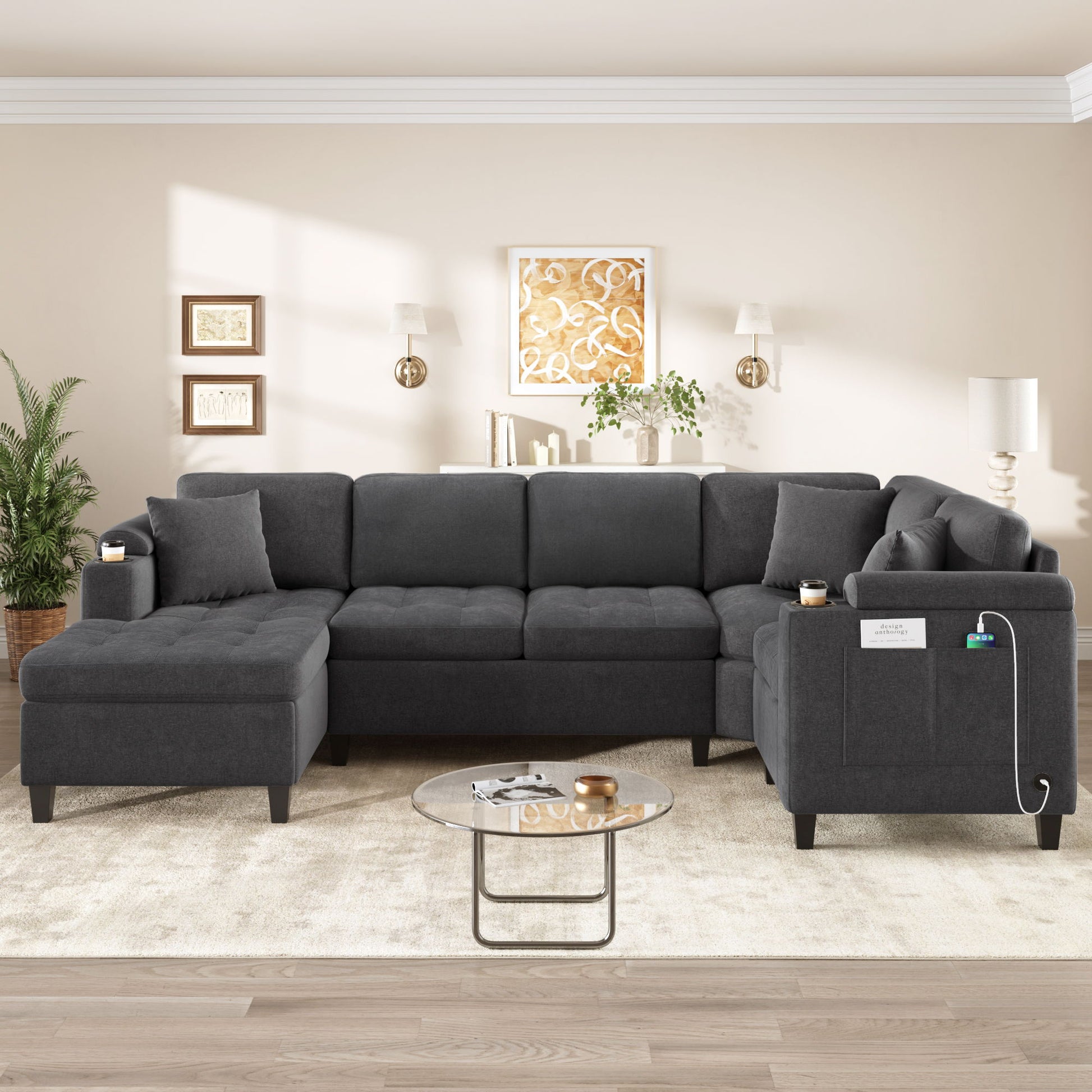 U Shaped Sectional Sofa, Corner Living Room Couch With Built In Cup Holders, Storage, USB Ports