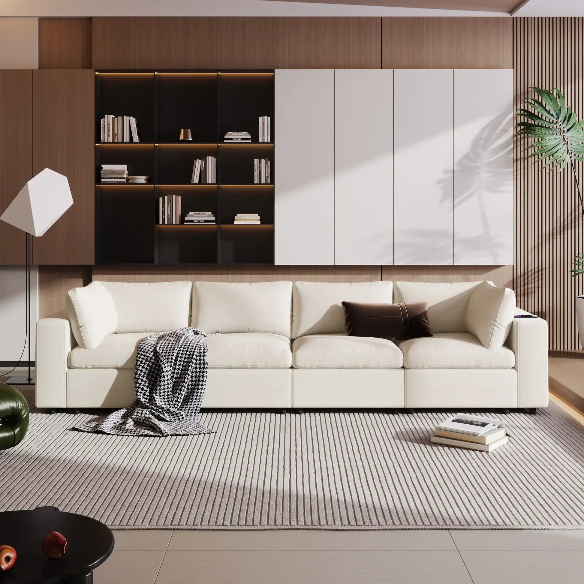 Enjoy next-level convenience with built-in USB ports, wireless charging, and Bluetooth speakers integrated into the armrests, making it easy to stay connected and entertained. With sturdy plastic legs, a robust plywood frame, and ample storage, this sectional is as practical as it is beautiful. Its spacious dimensions and versatile configuration make it ideal for both relaxing and entertaining in any modern home.