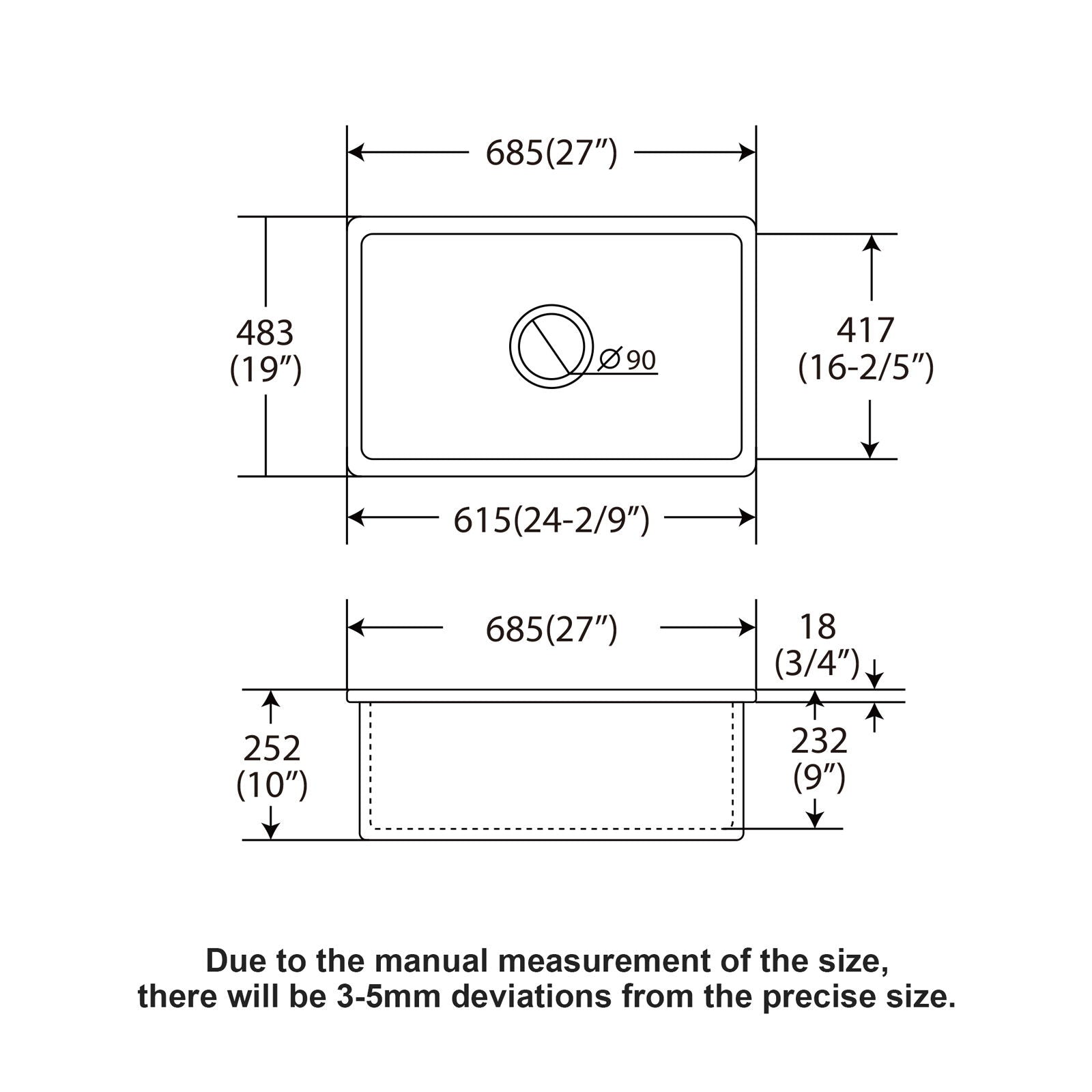 27" Undermount Single Bowl Kitchen Sink Rectangular Deep Bas With Dual Mount Installation - White