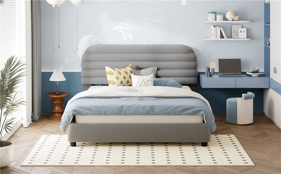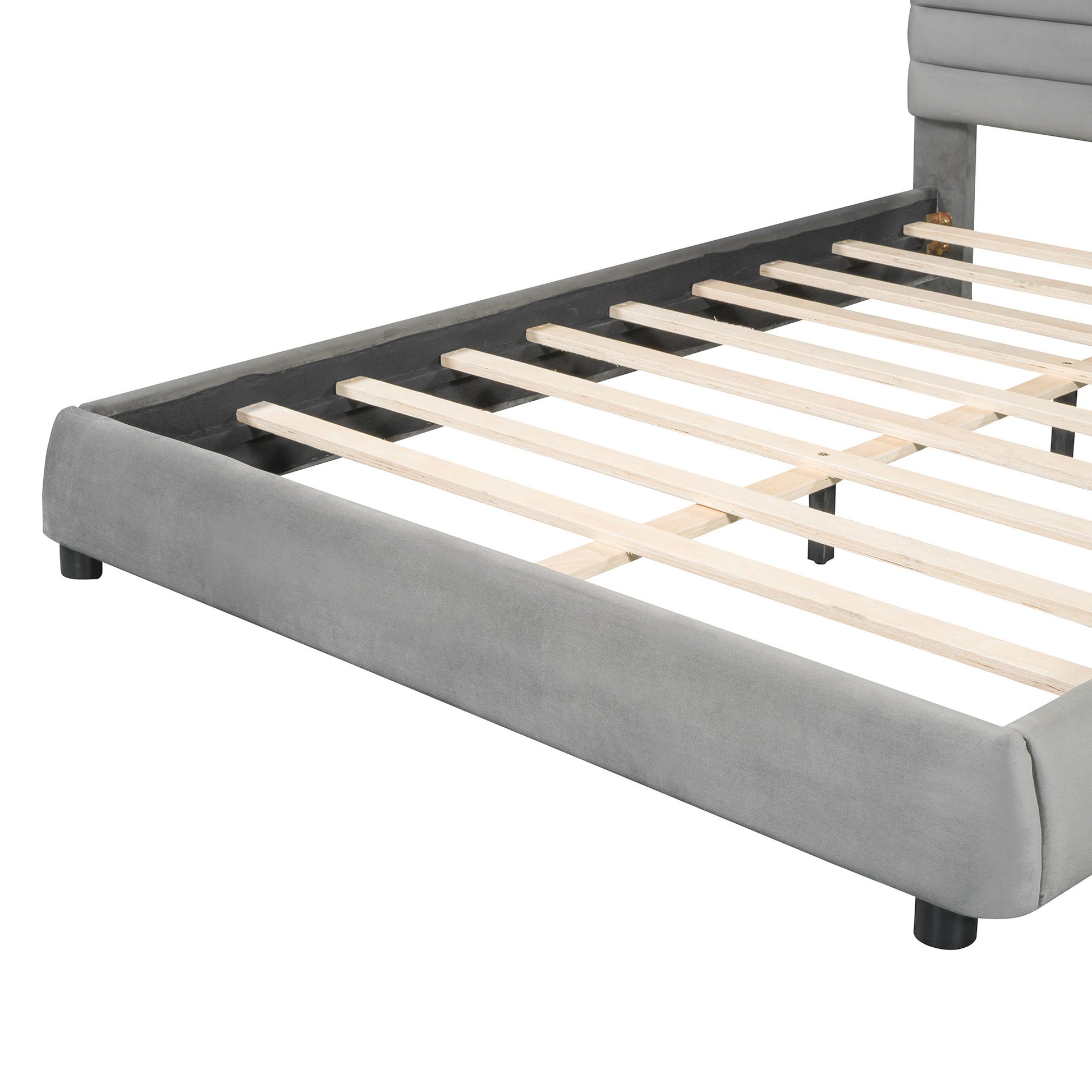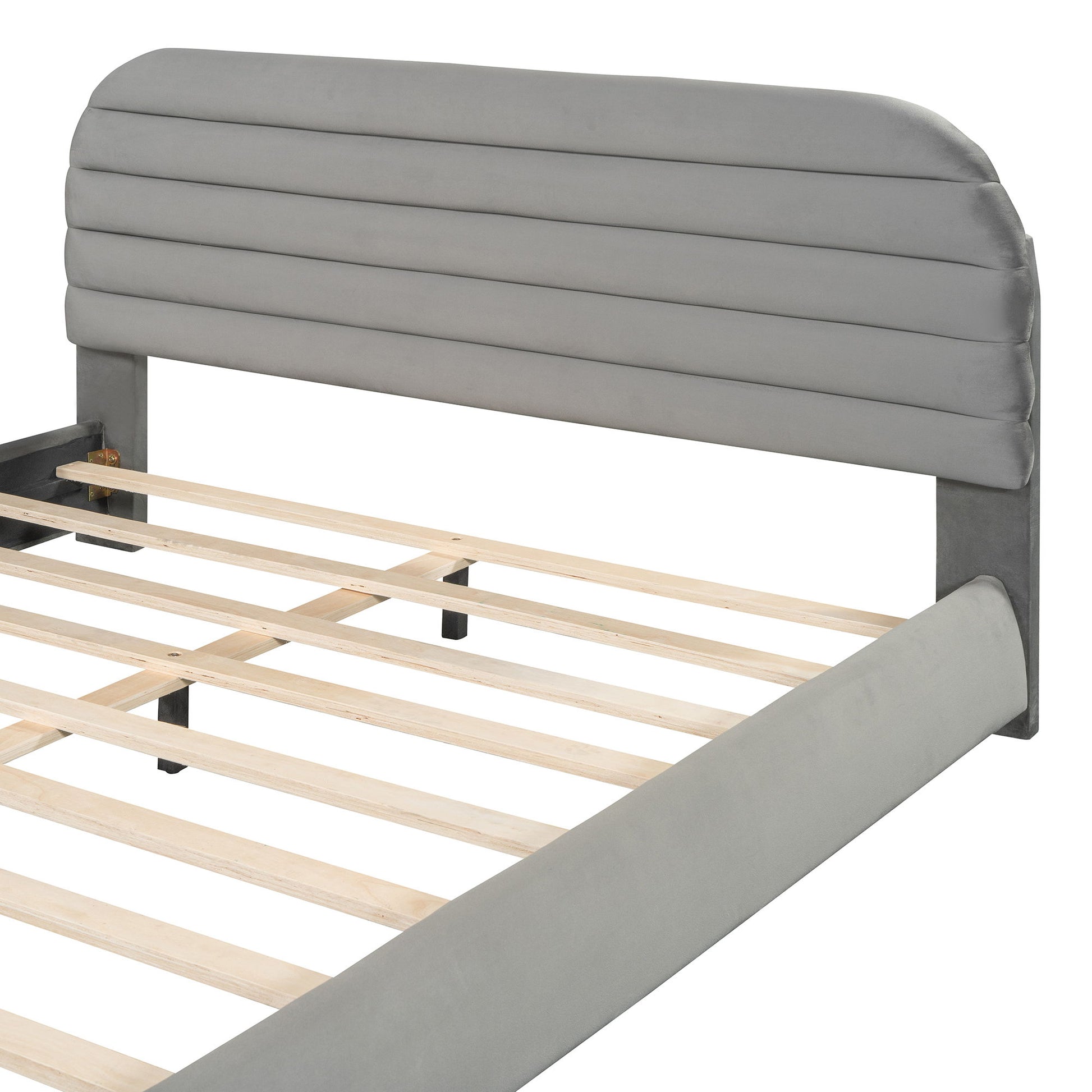 Queen Size Upholstered Platform Bed Frame And Stylish Curve Shaped Design - Gray