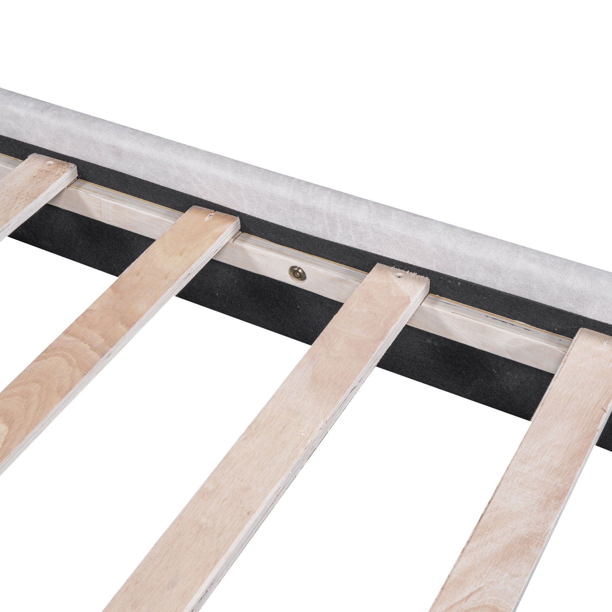This beautiful upholstered platform bed adds a contemporary chic look to your bedroom and is upholstered in thick polyester fabric for extra comfort. Two large headrests at the headboard provide luxurious comfort and support for lounging, reading, or watching TV in bed. The sturdy wood frame construction and wooden slat system ensure stability and safety. Enjoy years of relaxation and family fun with this meticulously designed platform bed that serves as both a beautiful room centerpiece and a cozy family retreat.