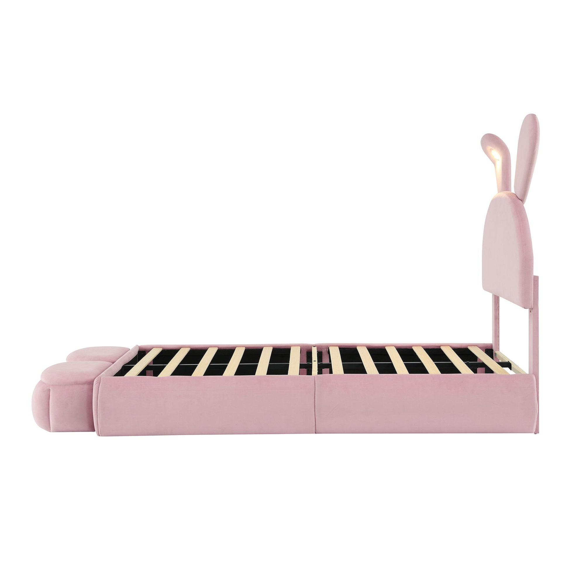 Twin Size Upholstered Platform Bed With Cartoon Ears Shaped Headboard And Light - Pink