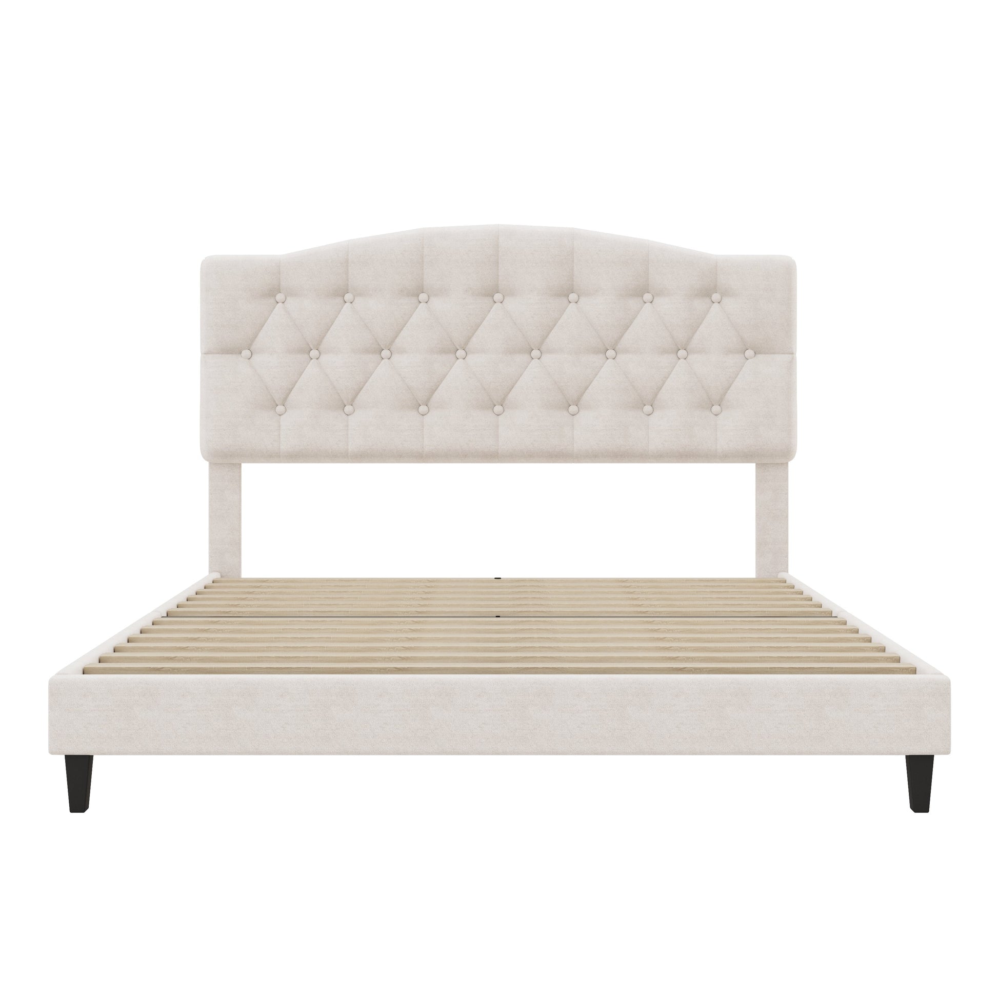 This queen-sized upholstered platform bed is designed for the bedroom, combining functionality and style with a contemporary diamond tufted curved headboard. It provides a supportive and elegant sleeping solution without the need for a box spring.