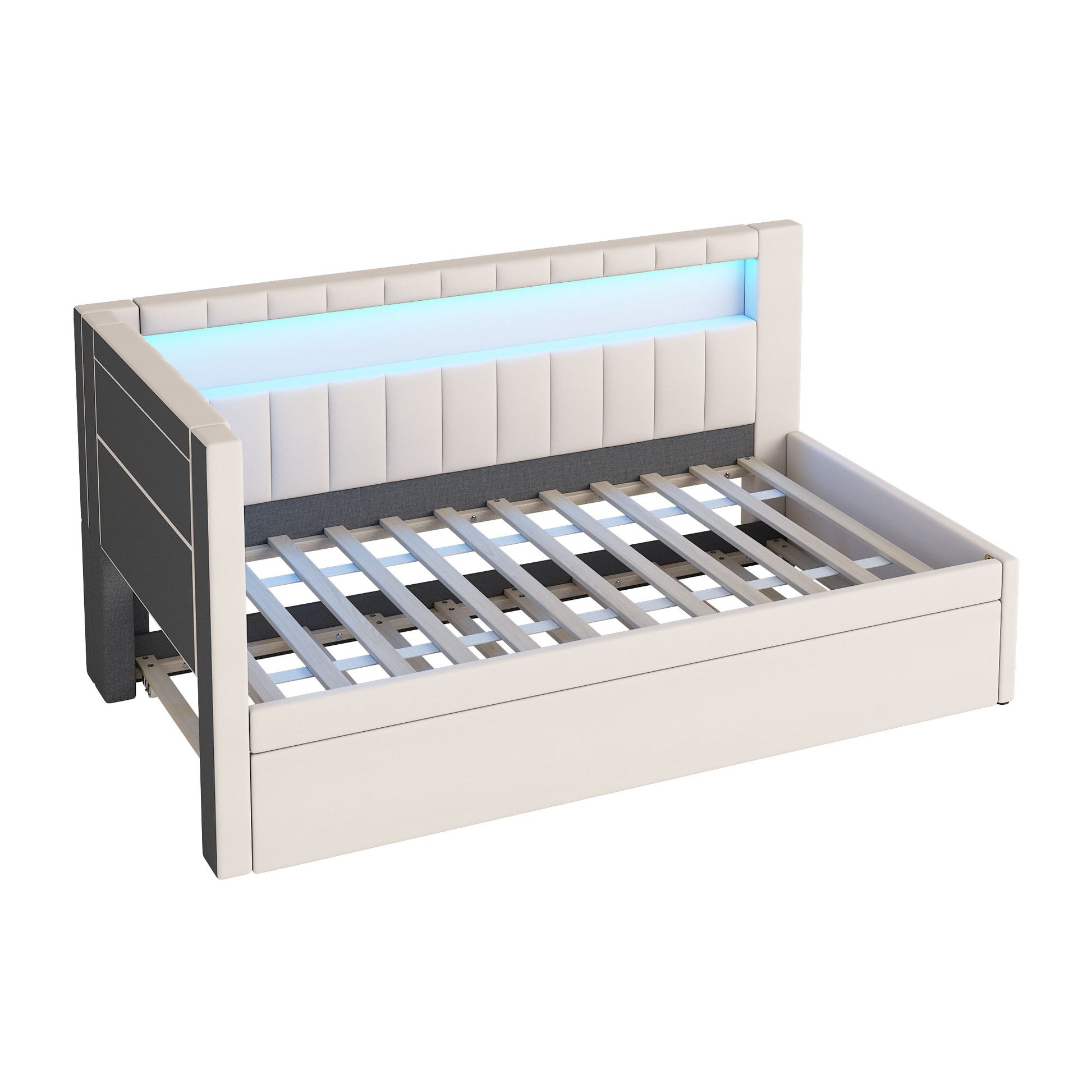 Twin Upholstered Platform Bed With USB Ports And LED Belt, Includes Trundle - White
