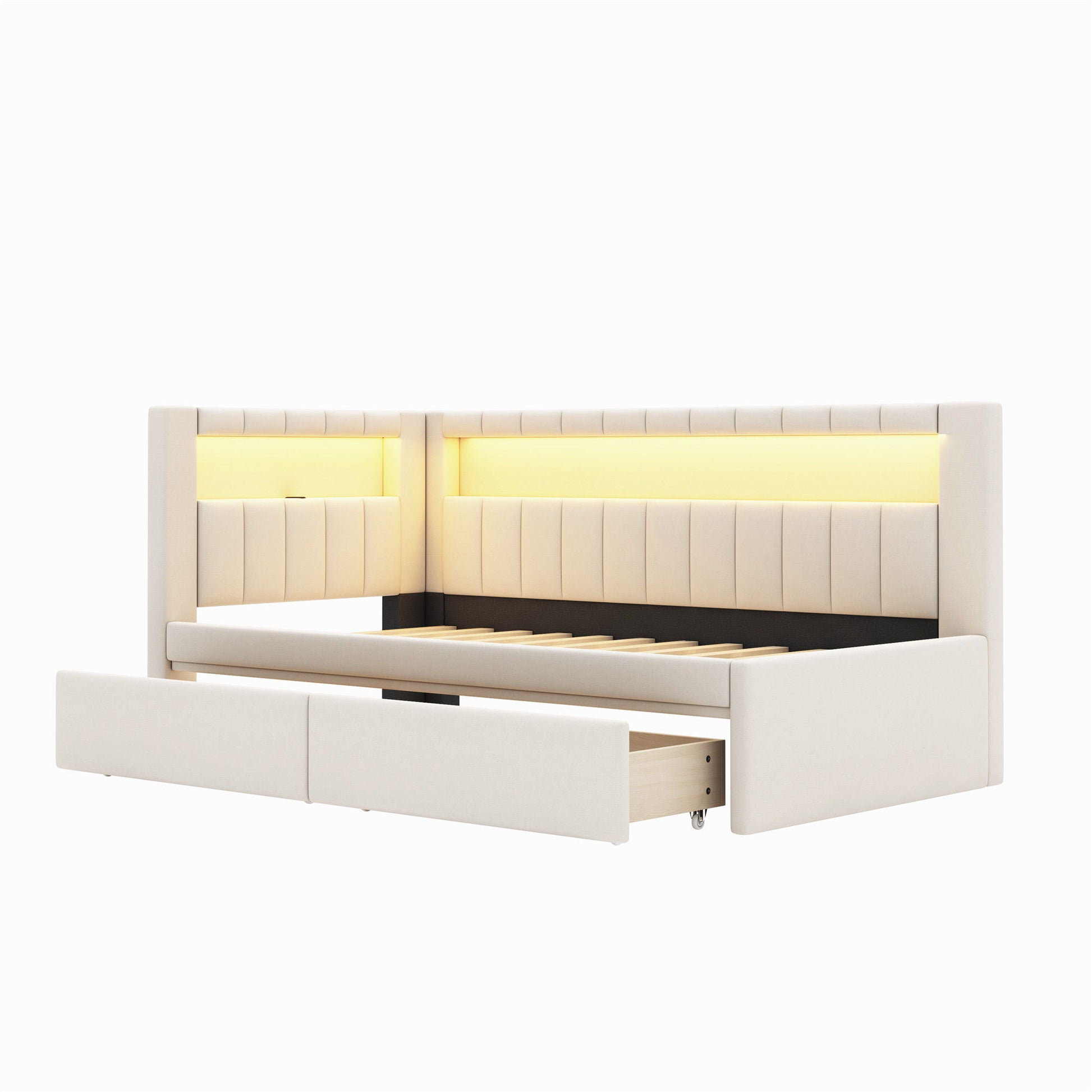 Twin Upholstered Platform Bed With USB Ports And LED Belt, 2 Drawers - White