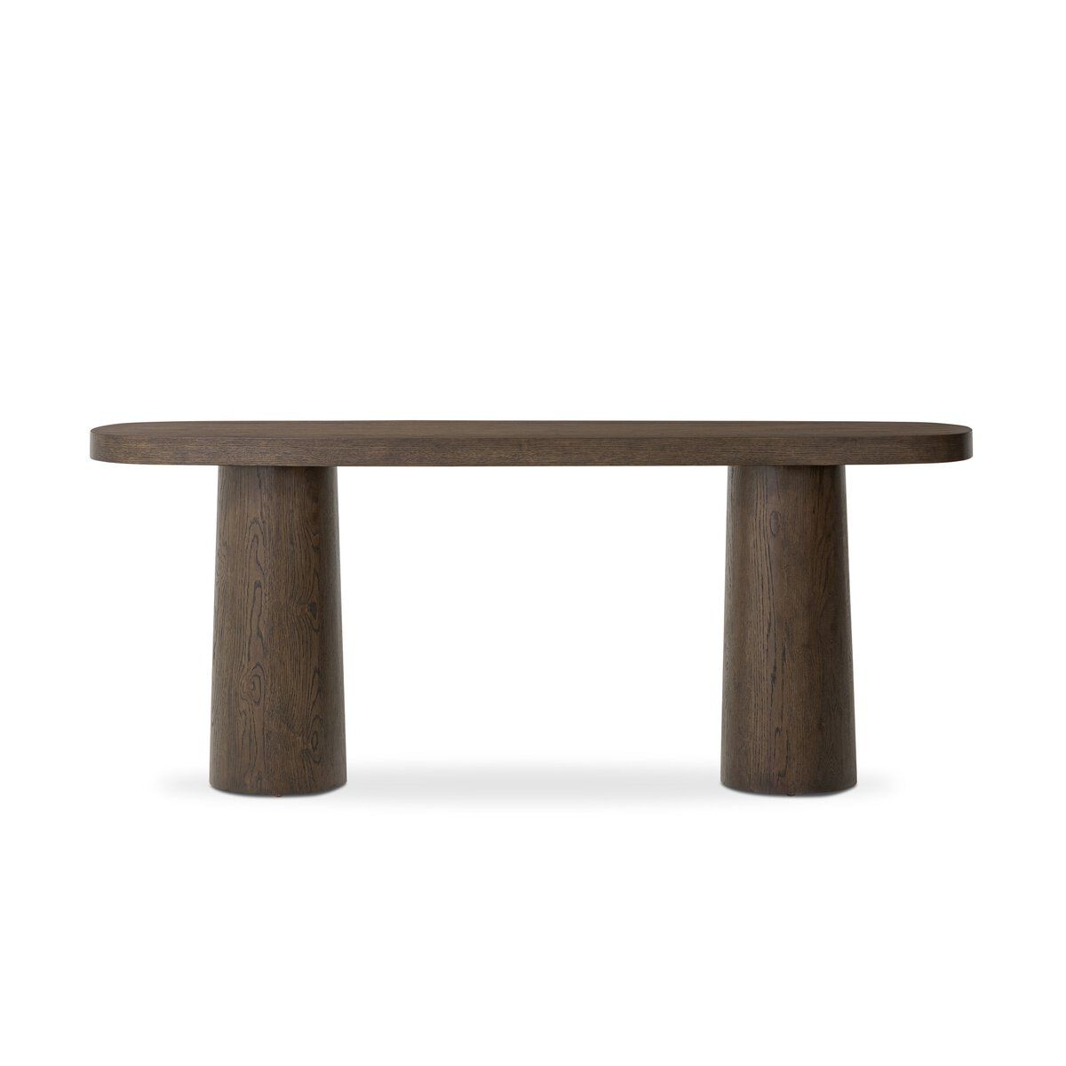 Crafted to command attention through form alone, the Four Hands Valen Console Table balances sculptural presence with a refined, open silhouette. Rustic brown oak brings warmth and depth, while the polished, pill-shaped top introduces a softened modern edge that feels both intentional and elevated.
