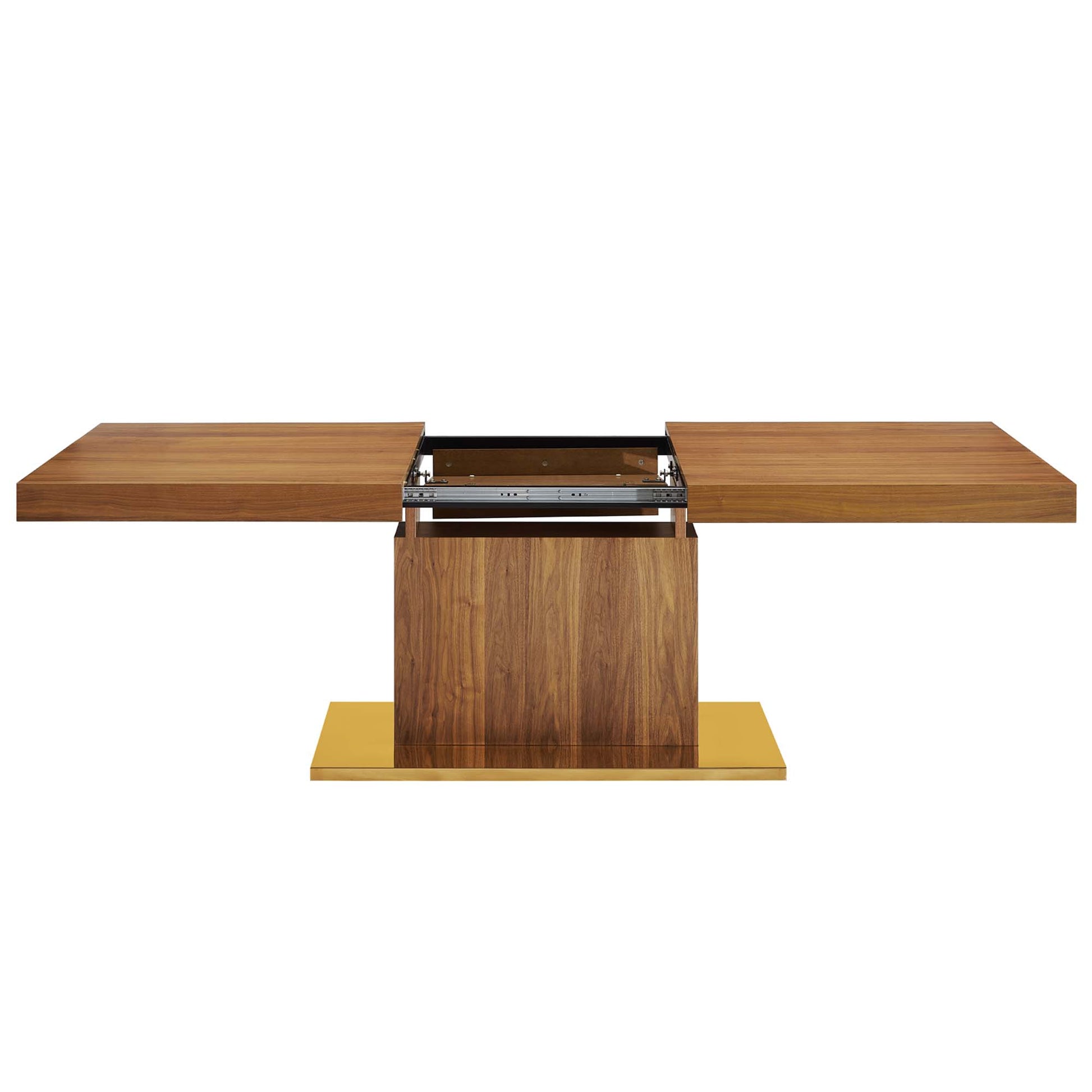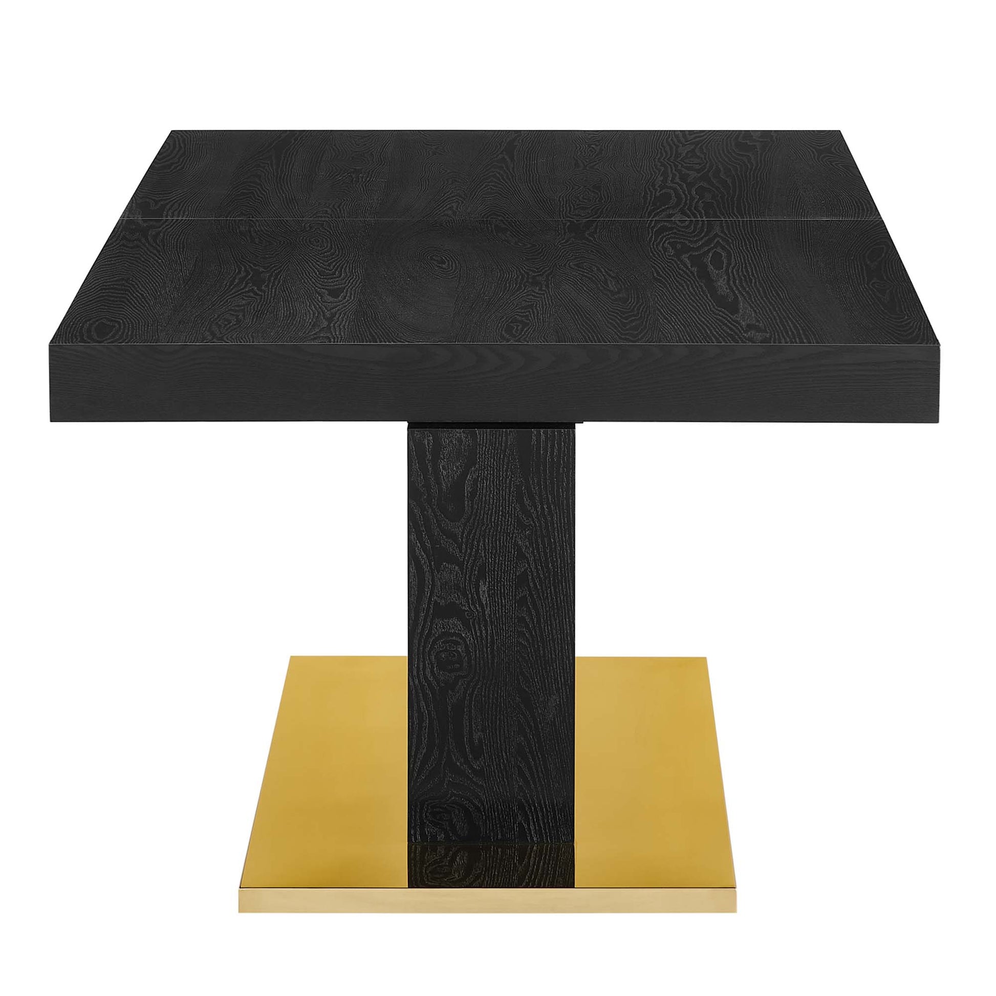 Reimagine your dining decor with the Vector Expandable Dining Table. Tailored for all occasions from intimate dining to festive gatherings, the organic wood grain surface on this dining table is perfect for haute cuisine and home cooking. Featuring durable fiberboard construction, wood veneer, a gold stainless steel base, a butterfly leaf with a lock that collapses inside the distinguished columnal base with ease, and non-marking foot pads to help protect your flooring, Vector comfortably seats up to eight people and extends from 71 to 94.5 inches.