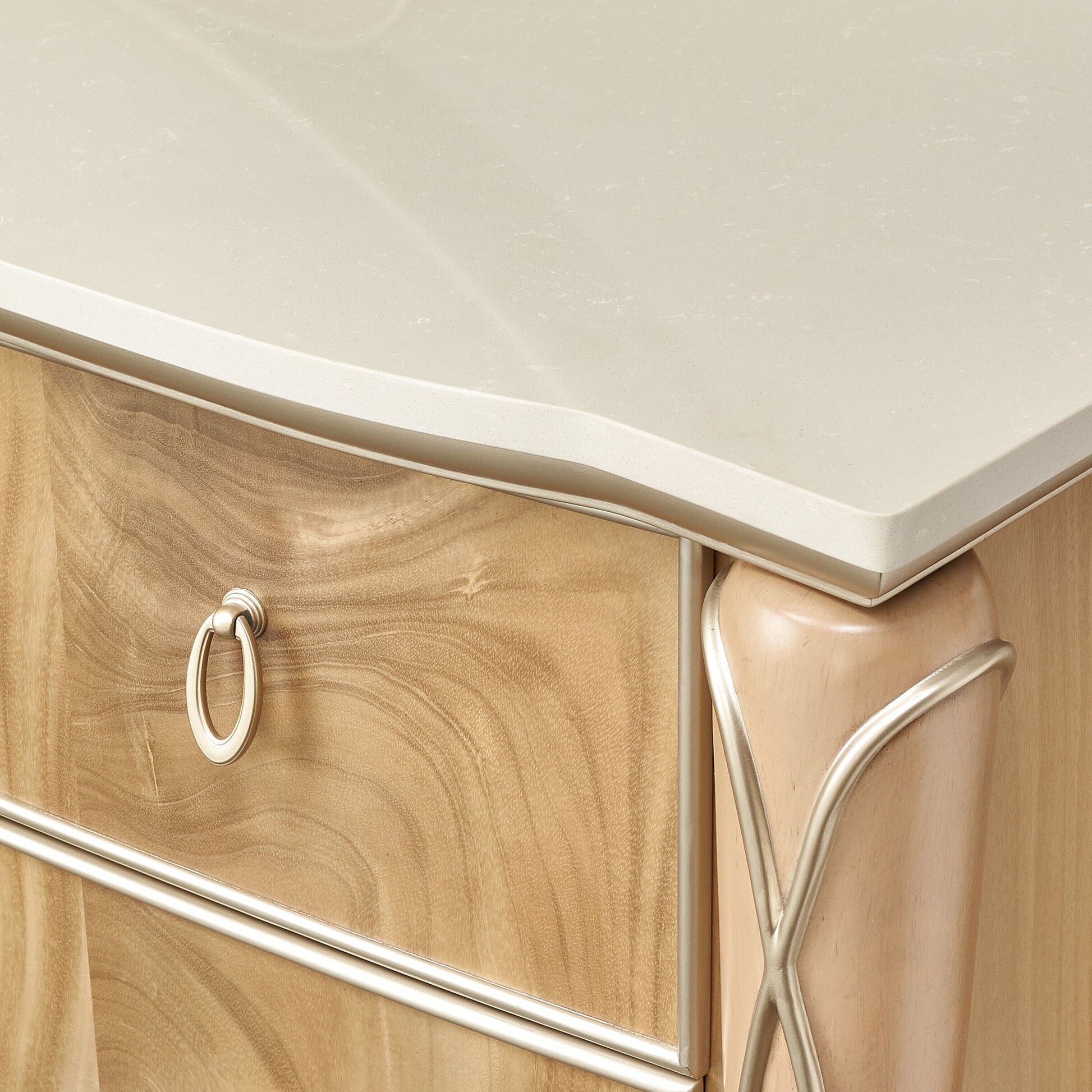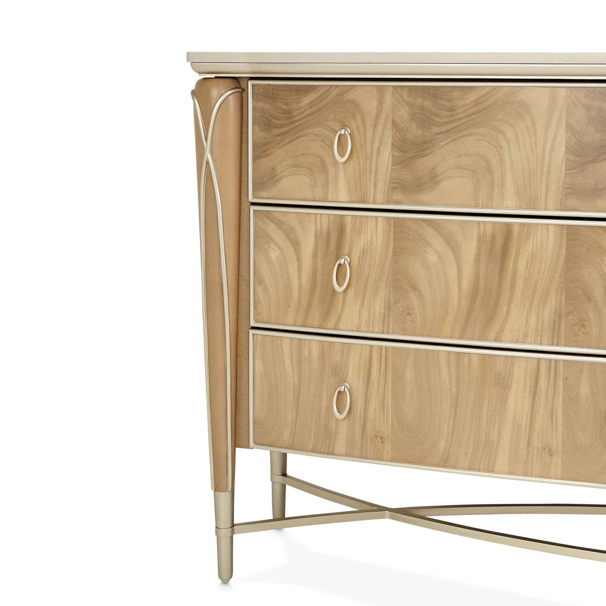 Find elegance in every detail with the Villa Cherie Dresser. Featuring a subtly shaped case front, sweeping accents, and velvet lined hidden storage, this piece creates a beautiful space for clothes, accessories, and décor.
