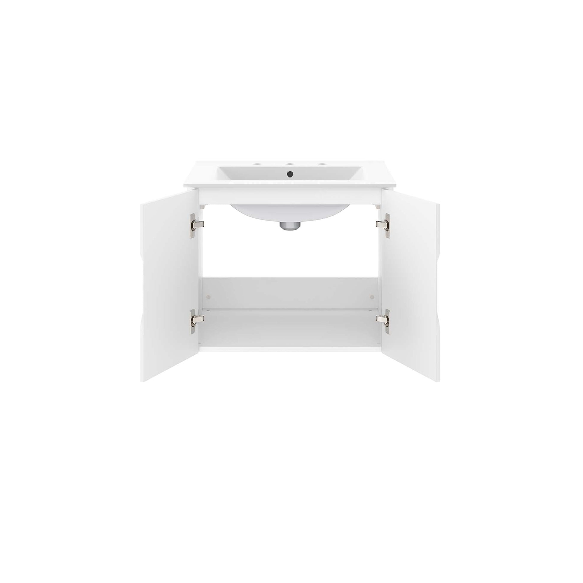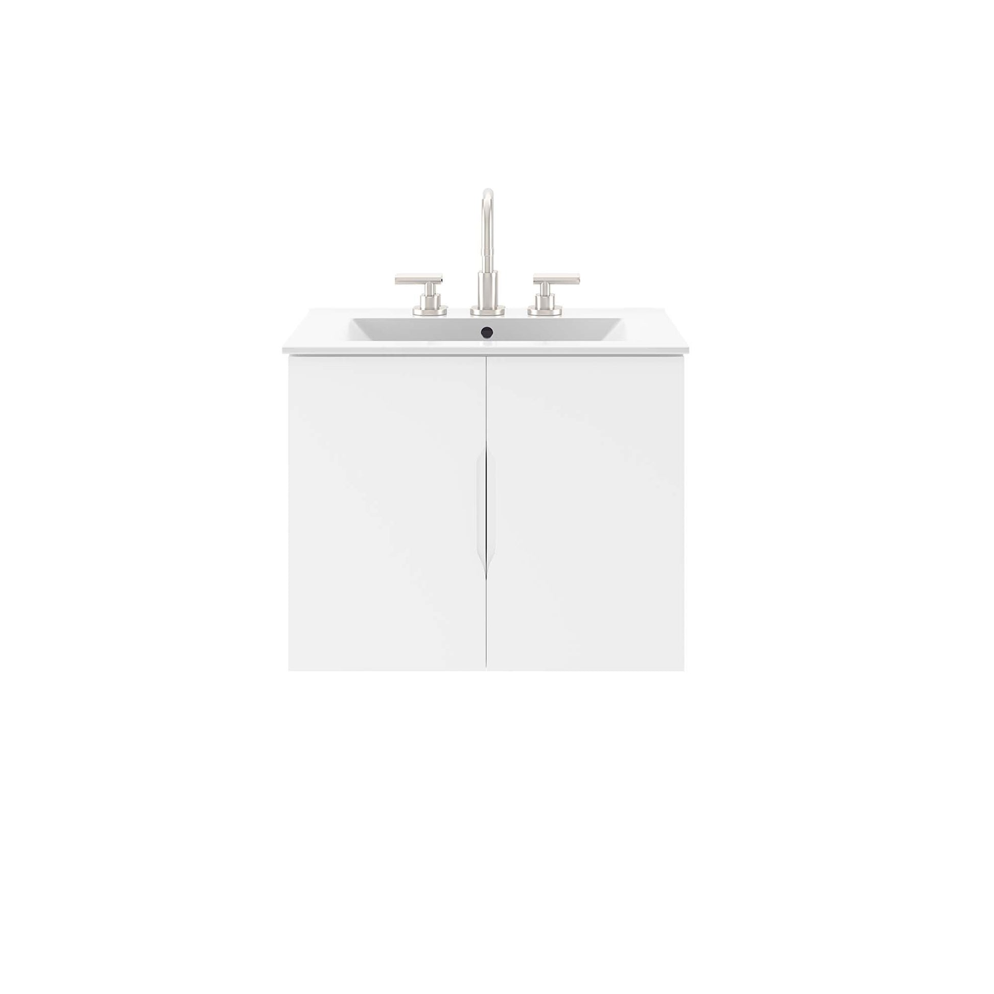 Energize your bathroom space with the modern design of the Vitality 24" Wall-Mount Bathroom Vanity. Boasting a sleek, clean-lined silhouette, this vanity is durably crafted with particleboard and MDF with a melamine finish. This vanity features a wall-mount design and is complete with ample storage space for all your bathroom essentials behind two soft-close doors. This vanity is complete with a ceramic sink basin with 8-inch widespread faucet holes and an integrated countertop. Organize bathroom essentials and keep counter space clean with ample storage space behind two soft-close doors. This vanity boasts an open back to accommodate plumbing. Fixtures not included. Assembly required.