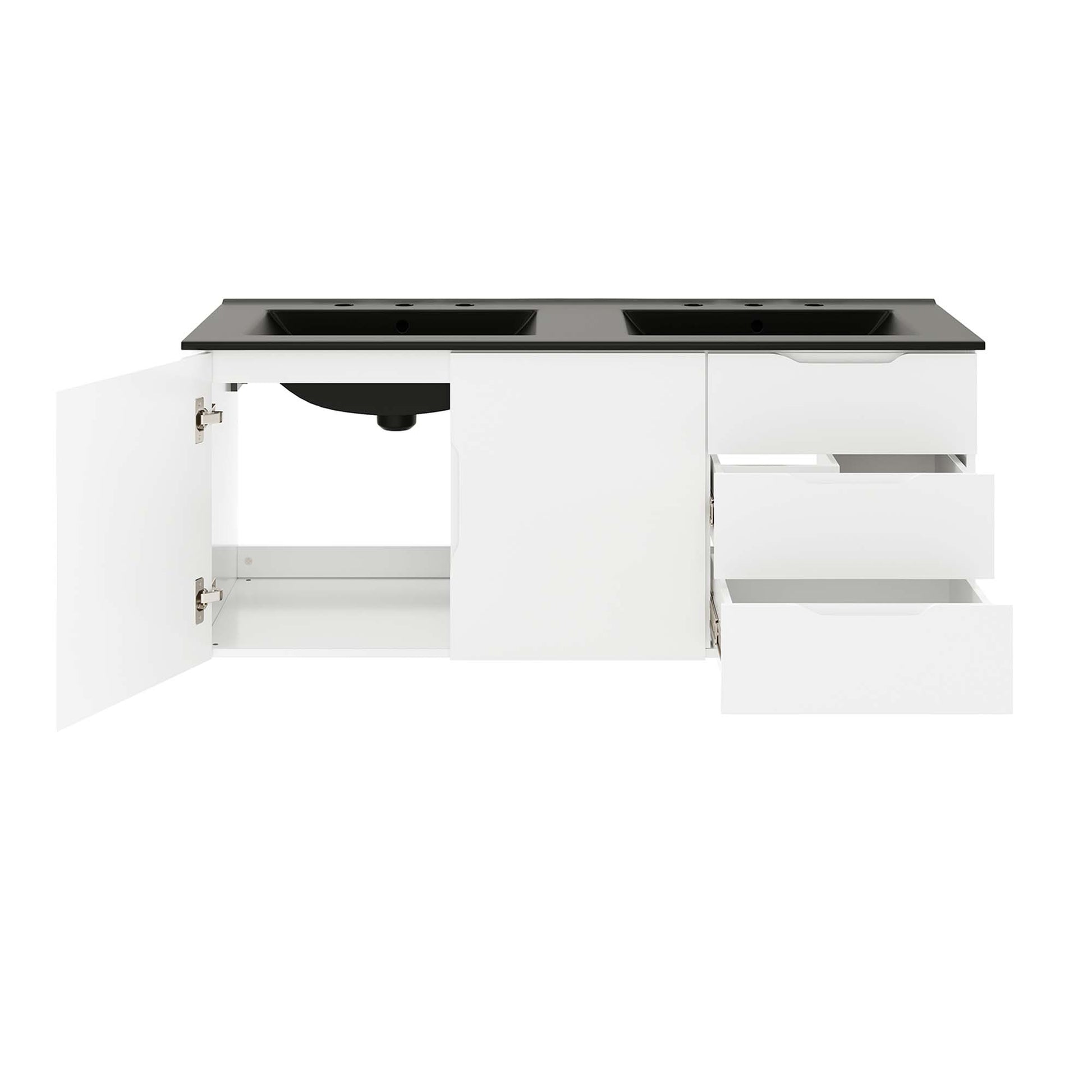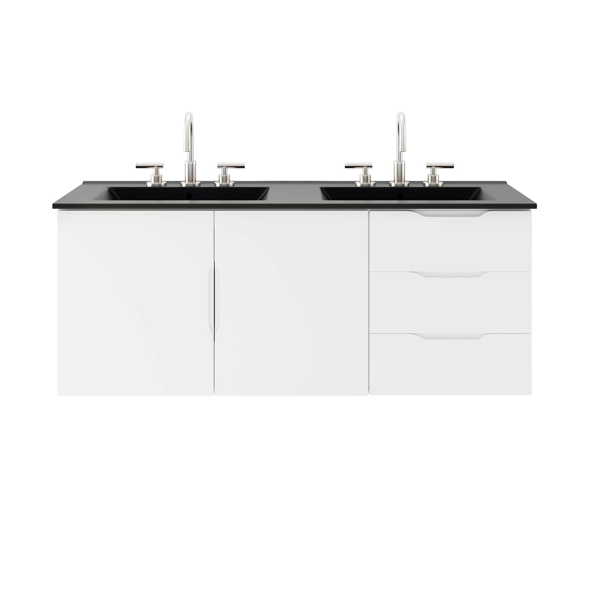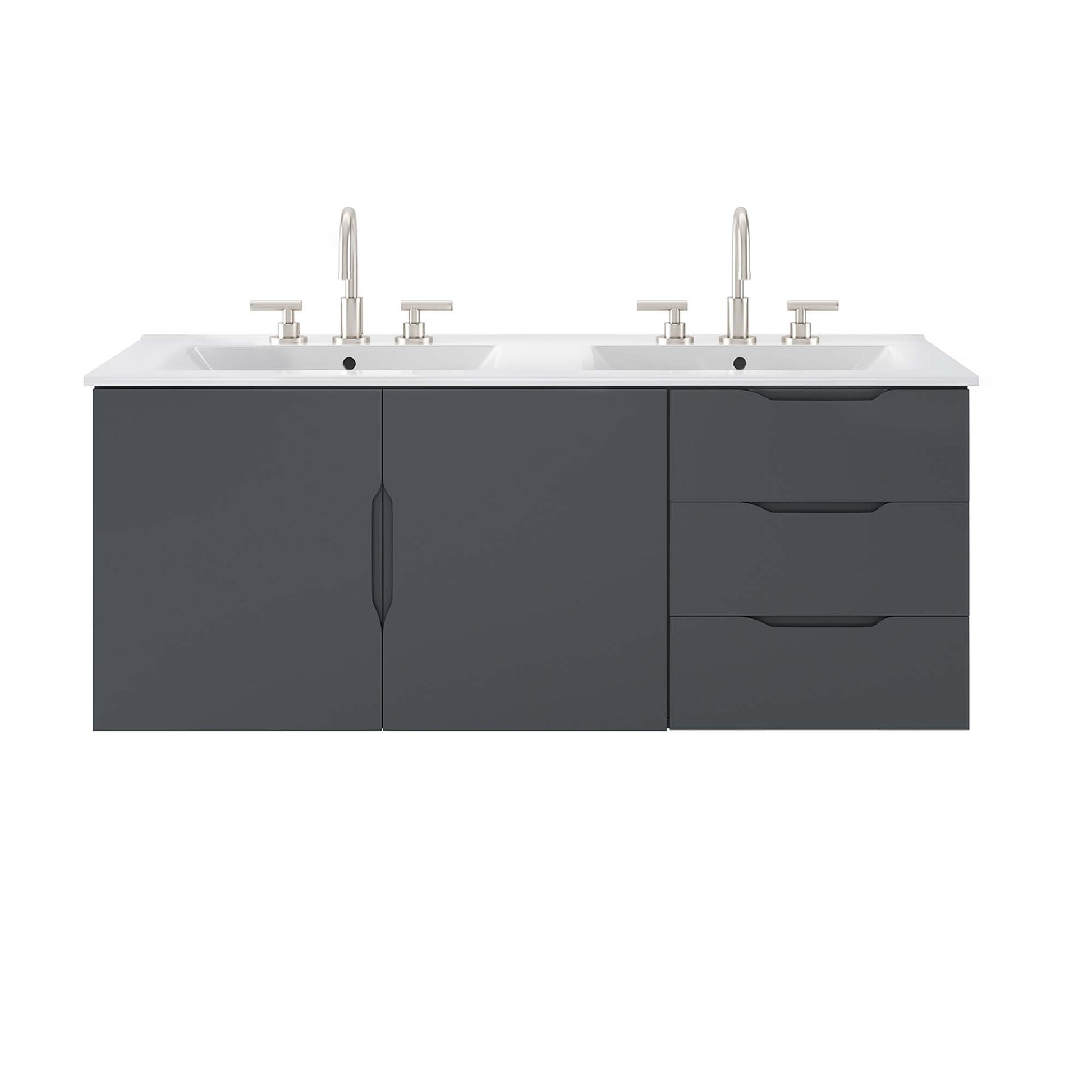 Energize your bathroom space with the modern design of the Vitality 48" Wall-Mount Bathroom Vanity. Boasting a sleek, clean-lined silhouette, this vanity is durably crafted with particleboard and MDF with a melamine finish. This vanity features a wall-mount design and is complete with ample storage space for all your bathroom essentials with two spacious drawers and an under-sink storage area behind two soft-close doors. This vanity is complete with a double sink ceramic basin with 8-inch widespread holes and an integrated countertop. This vanity boasts an open back to accommodate plumbing. This double sink has 8" between basins and 24" between basin sink holes. Fixtures not included. Assembly required.