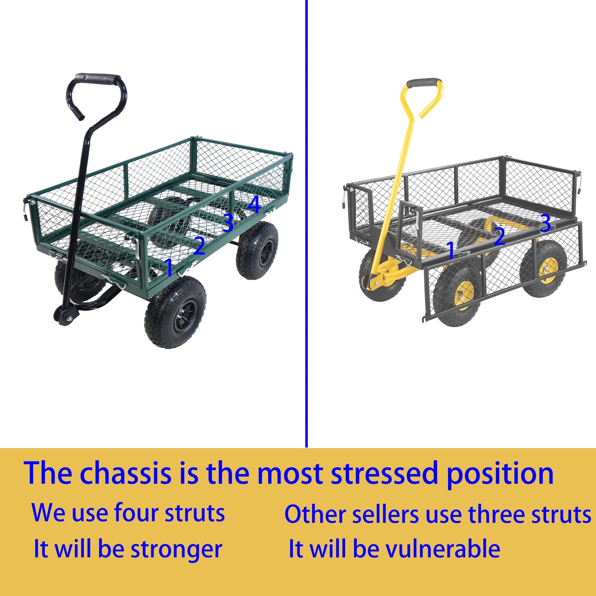 - Wide wheelbase with 10-inch rubber tires for stability and smooth movement