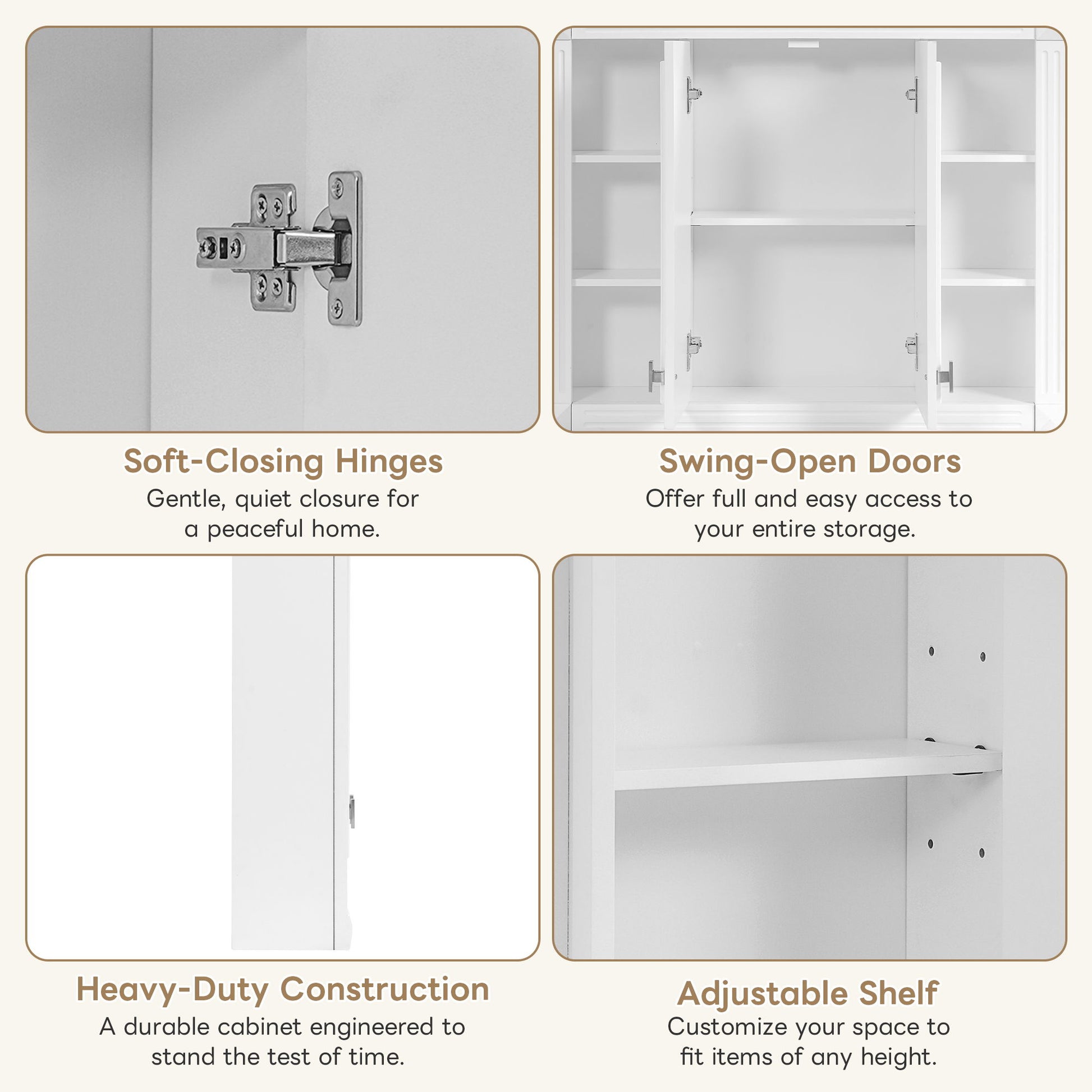- Soft-Closing Hinges: Smooth, quiet door closure prevents slamming and enhances durability and user experience.