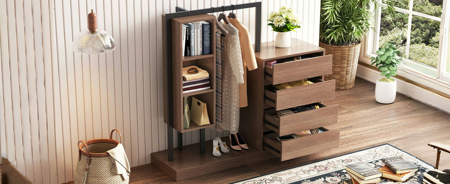 Keep your clothes and accessories tidy with three open storage compartments and multiple shelves, perfect for displaying or storing essentials.Featuring four generous drawers and additional cabinets, this wardrobe provides ample space for all your belongings, from clothes to shoes.Enjoy hassle-free setup with our straightforward instructions, allowing you to delve into organizing your space in no time.