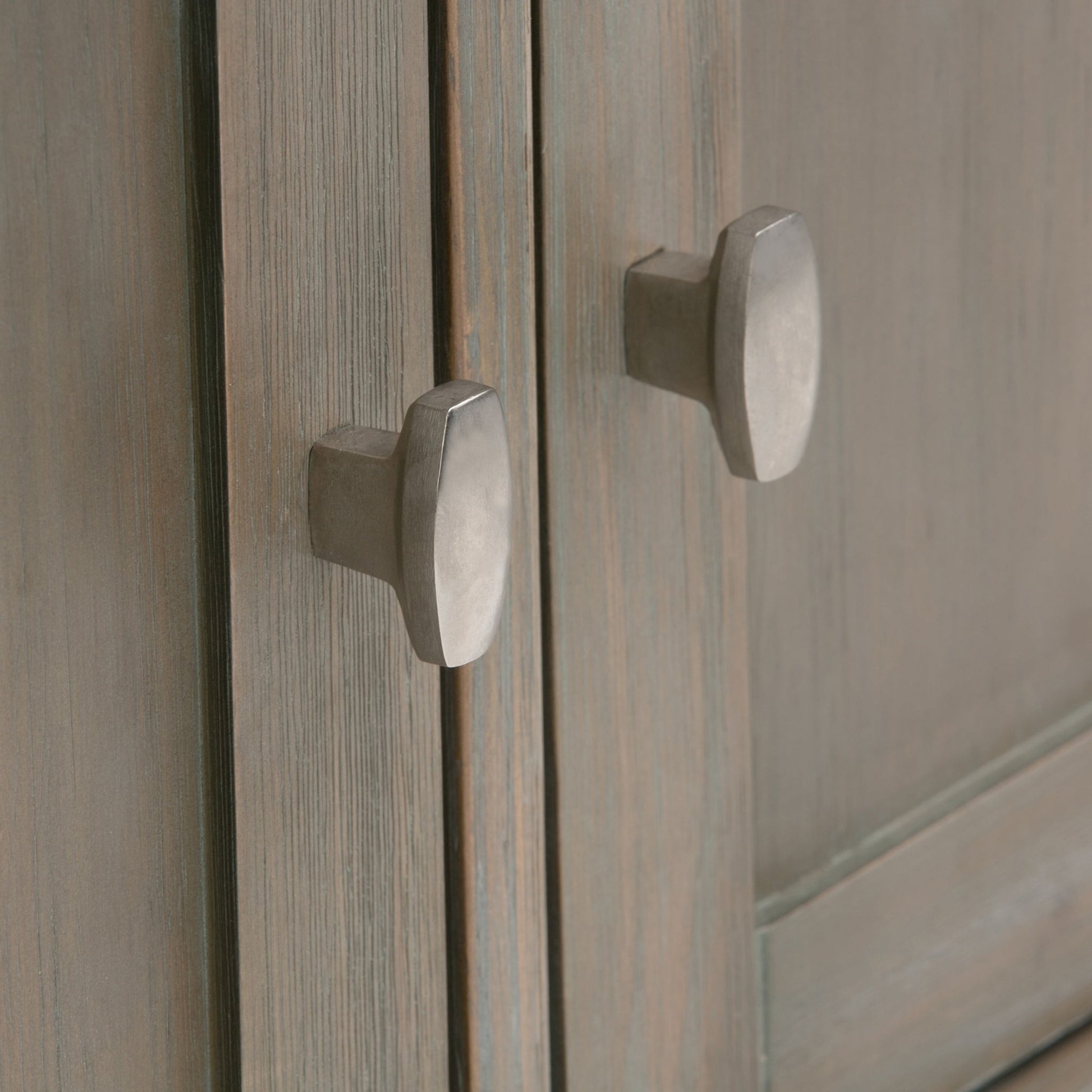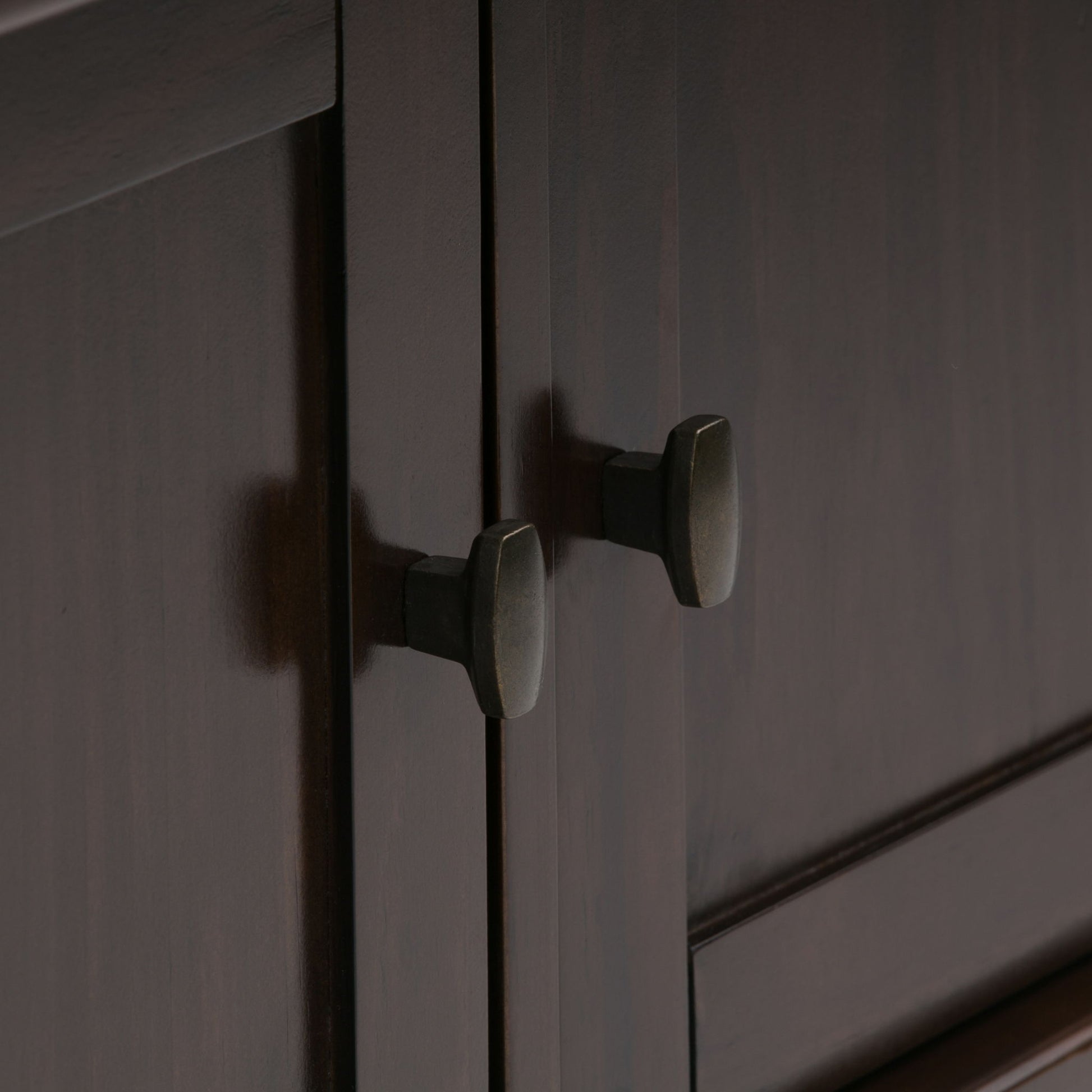 - Transitional Style includes rounded rectangular Bronze knobs and square tapered legs