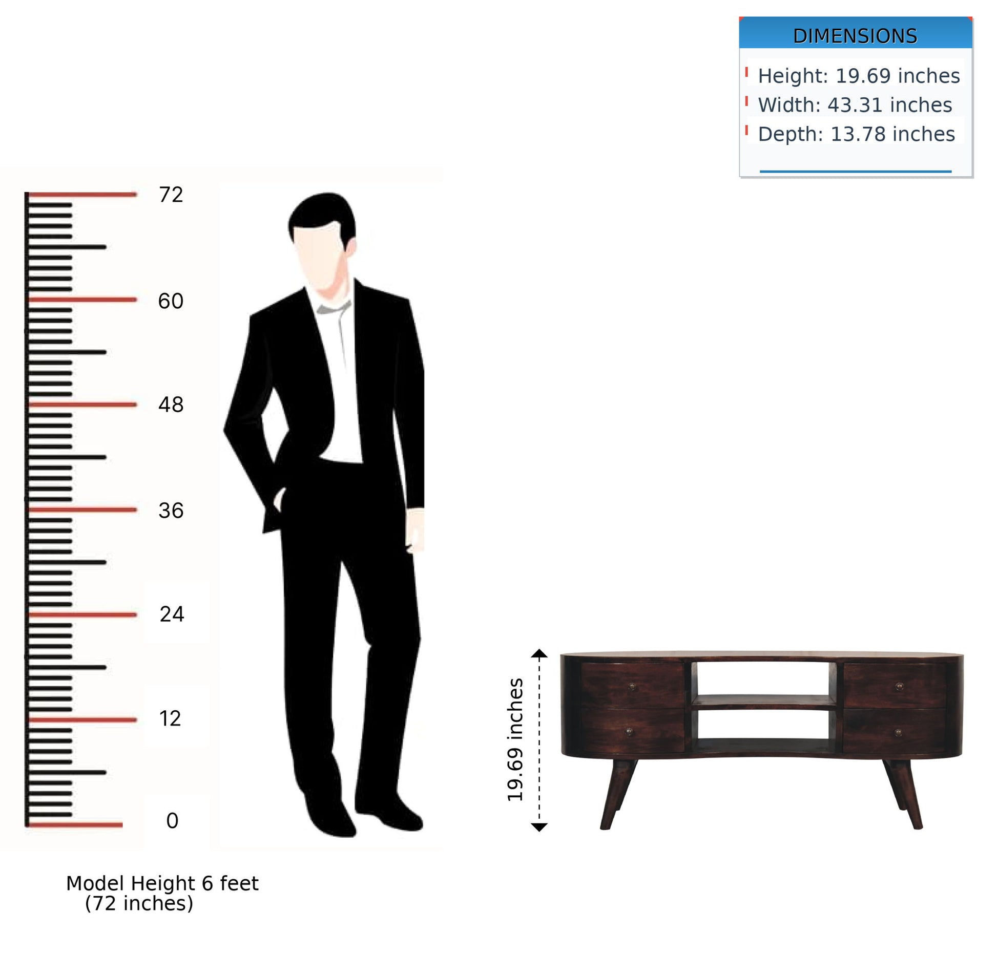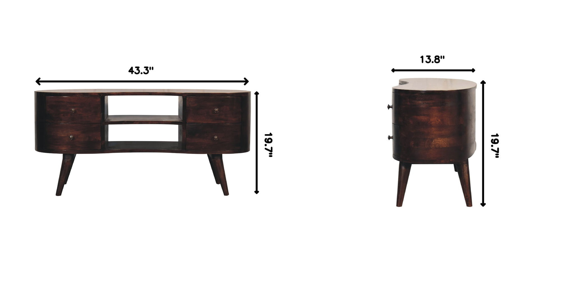 - Wave Entertainment Unit - This solid wood media unit has been constructed from 100% solid mango wood in a light walnut finish and offers a unique shaped design with rounded edges. It features four drawers that have shiny knobs and Nordic-style legs. A nice addition to the living room.