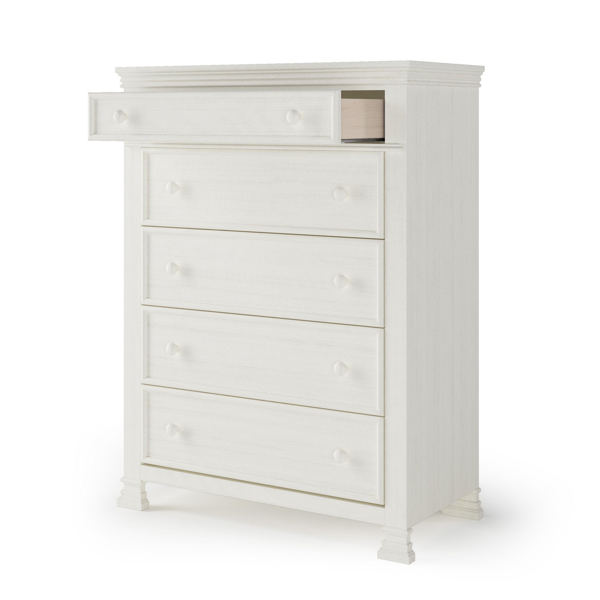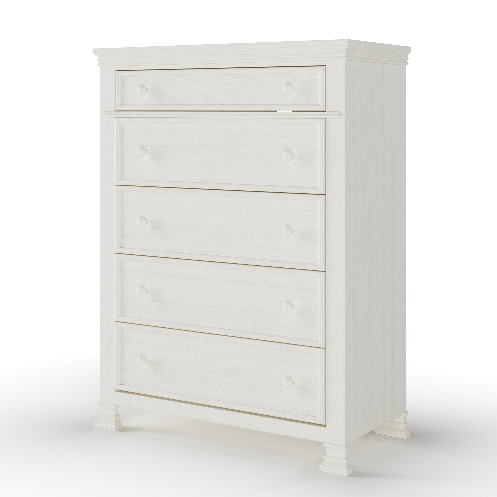 Functionality meets artistry with five generous, felt-lined drawers framed by English dovetail construction. Each drawer operates effortlessly, featuring smooth soft-close glides complemented by thoughtfully designed wooden pulls. This chest is not only an aesthetic asset; it offers practical storage solutions, making it an indispensable addition to your nursery. Complete your decor with matching items from the Legacy Westgate Collection to create a cohesive and elegant environment.